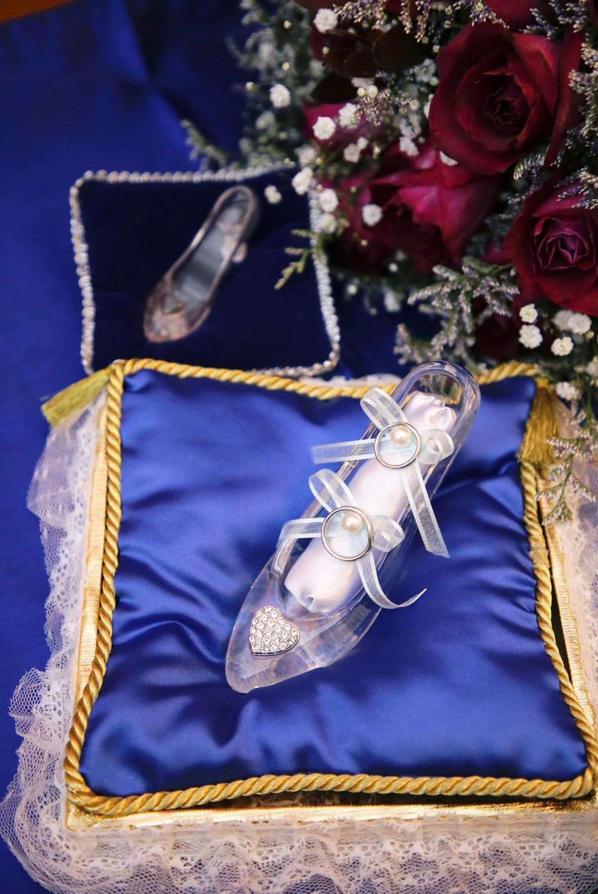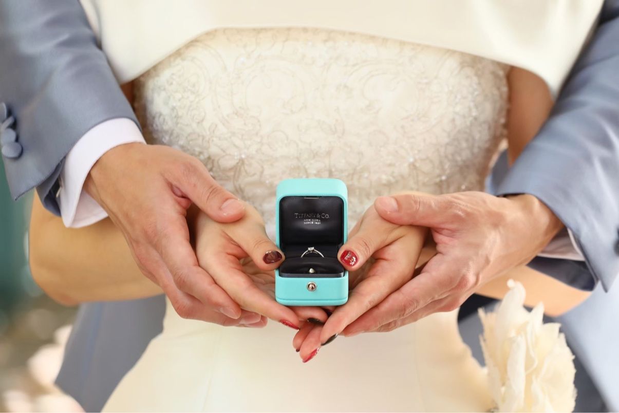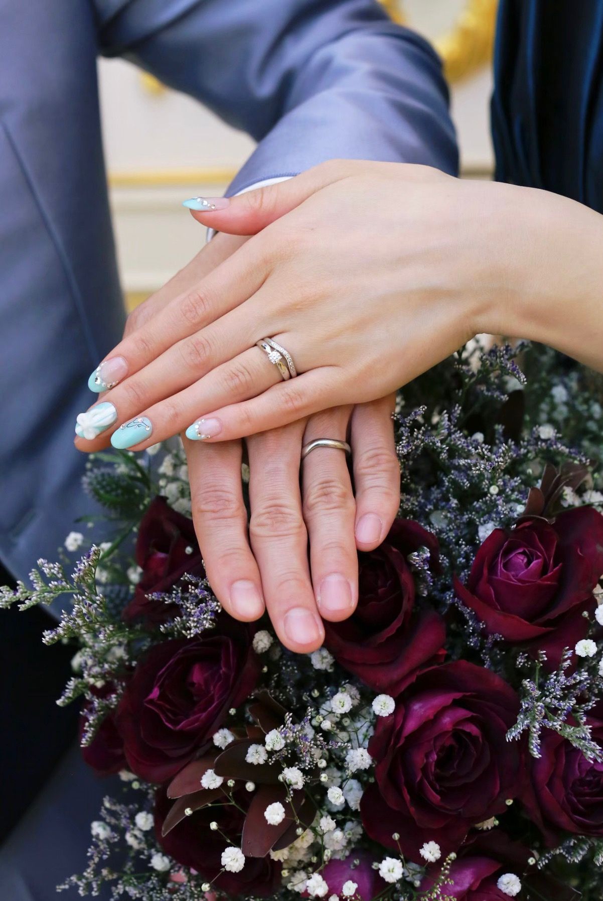 結婚指輪、婚約指輪共にTiffany&Co.ということもあり、ティファニー風にしました。左手の薬指には、プロポーズをしてもらった思い出のシンデレラ城の意味を込めて、ガラスの靴もついています。