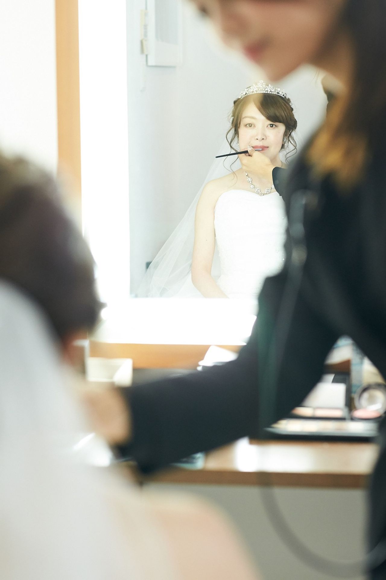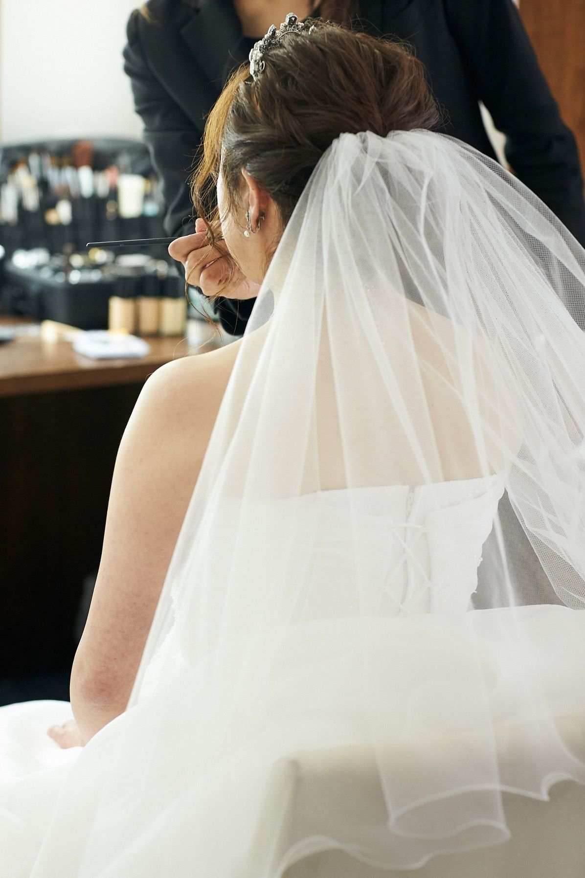 ウェディングドレスでは大きめのティアラを。、カラードレスではキラキラとしたダイヤ風のヘッドアクセサリーを付けました。