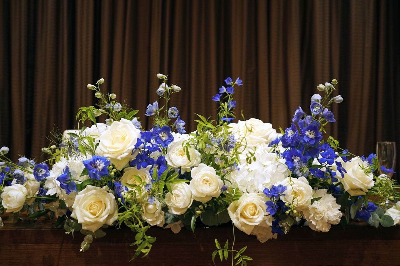 ブルーをメインに、ホワイト&イエローのお花を使いました。
