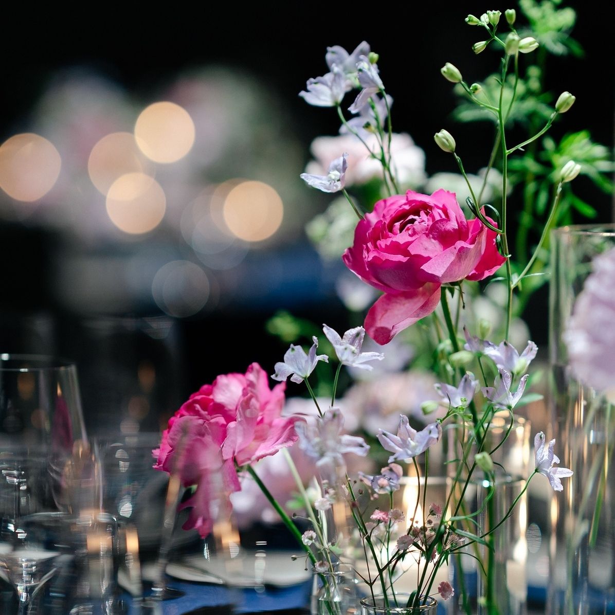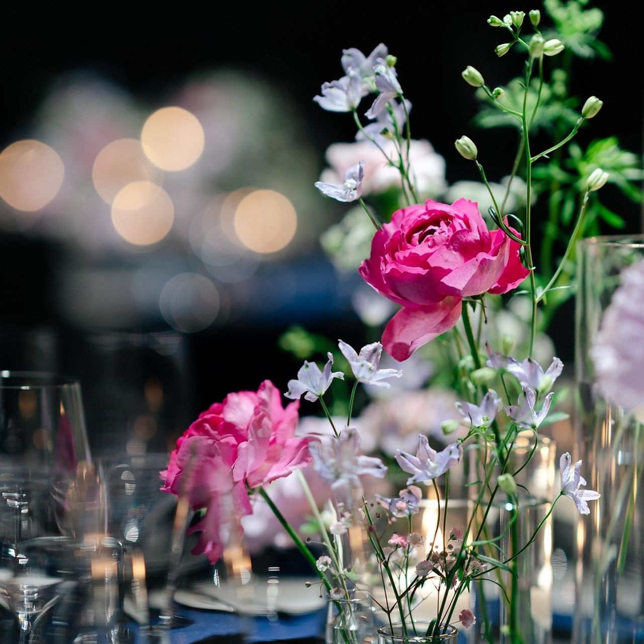 結婚式テーマでもある妖精がいそうな雰囲気にしたかったため、フローティングキャンドルや水中花、ガラス小瓶に生けるお花などを組み合わせていただきました。
