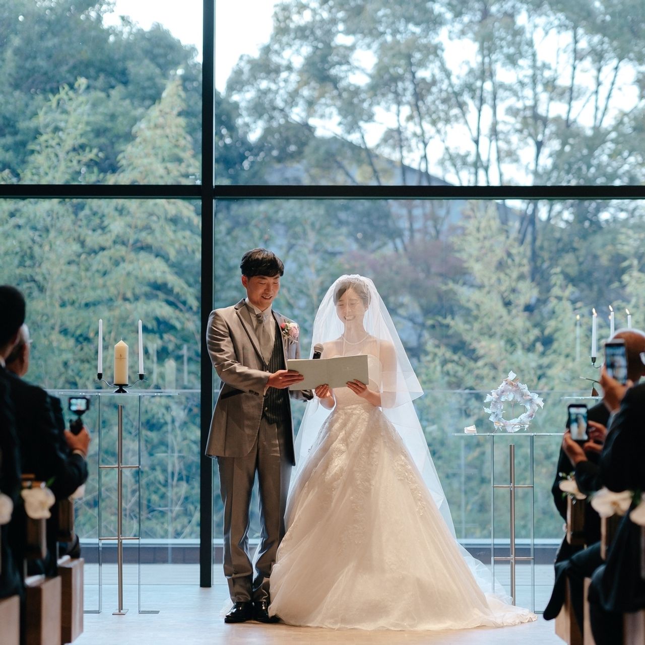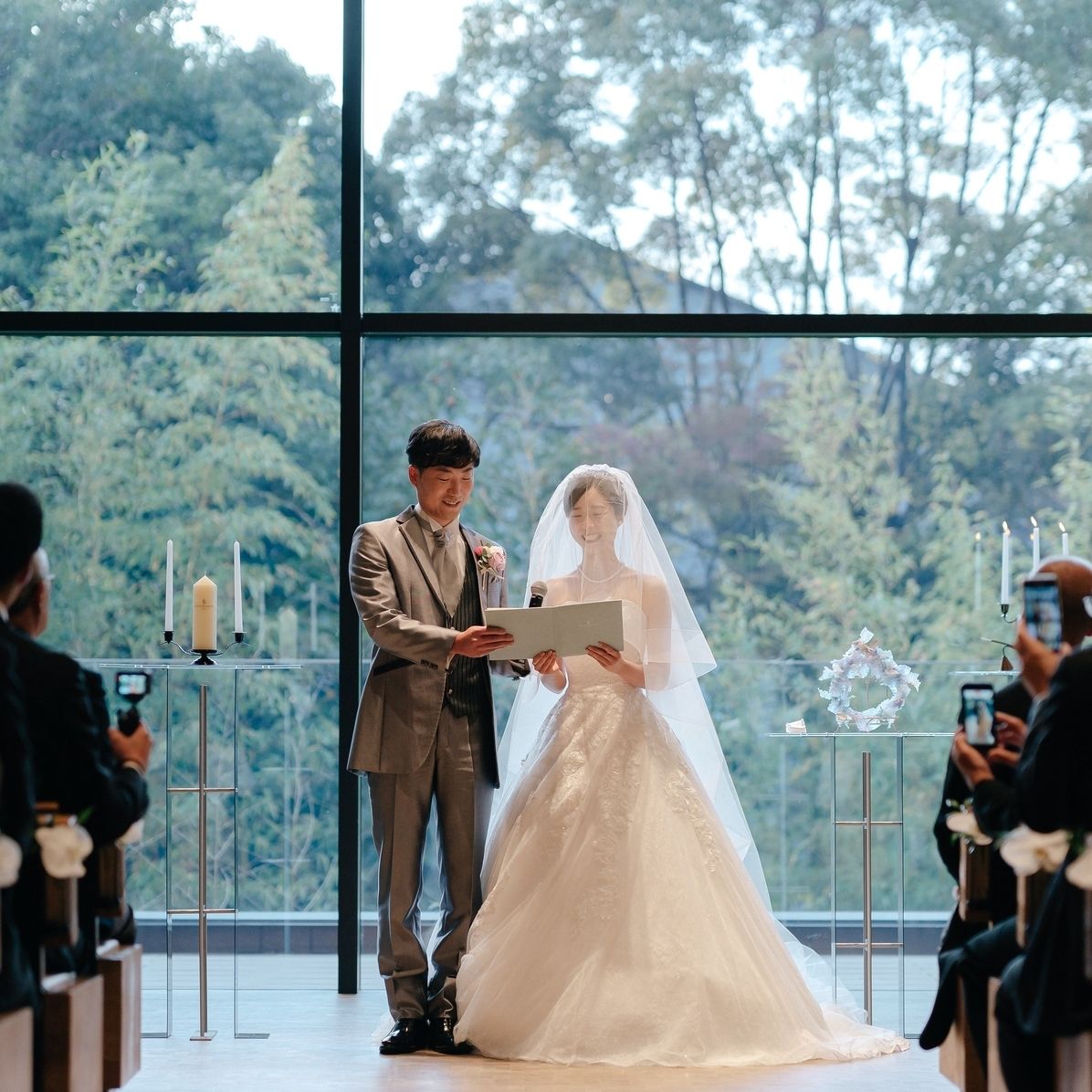 正面が大きな窓になっていて、自然光がたっぷり入る開放感のあるチャペルです。窓の外は人工物が見えず、緑が広がっていて季節の移ろいも感じられました。