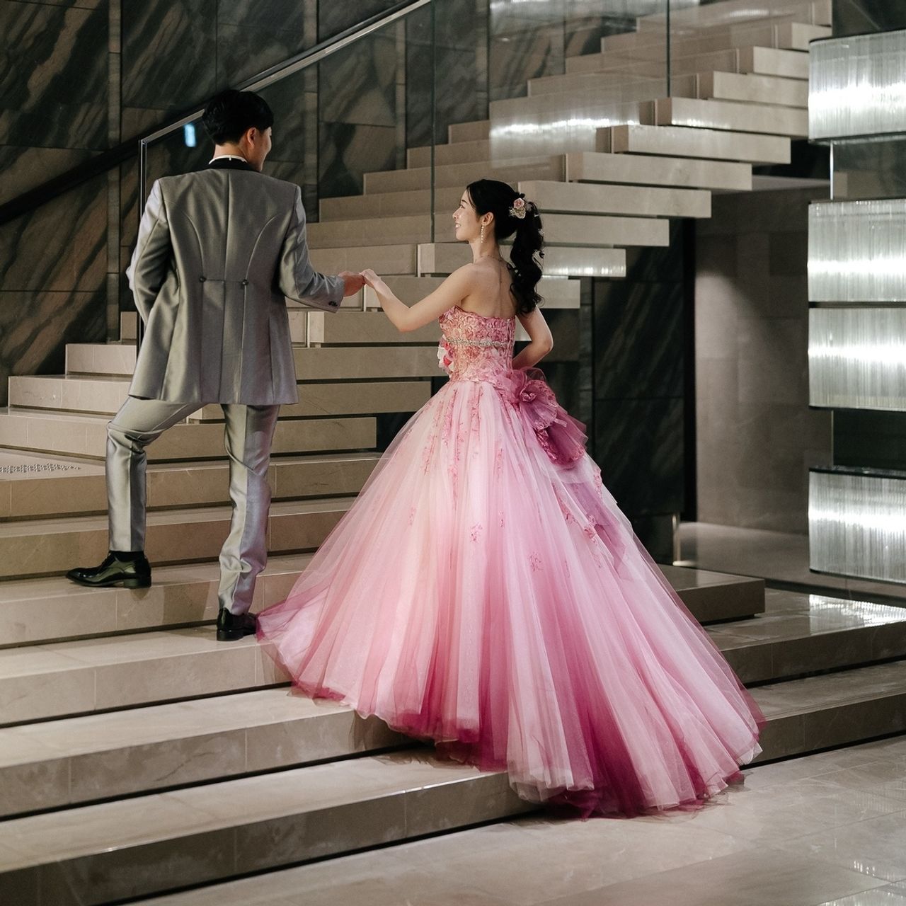 色はピンク〜シルバー〜パープルのグリッターグラデーションで、カラードレスに合わせて選びました。
