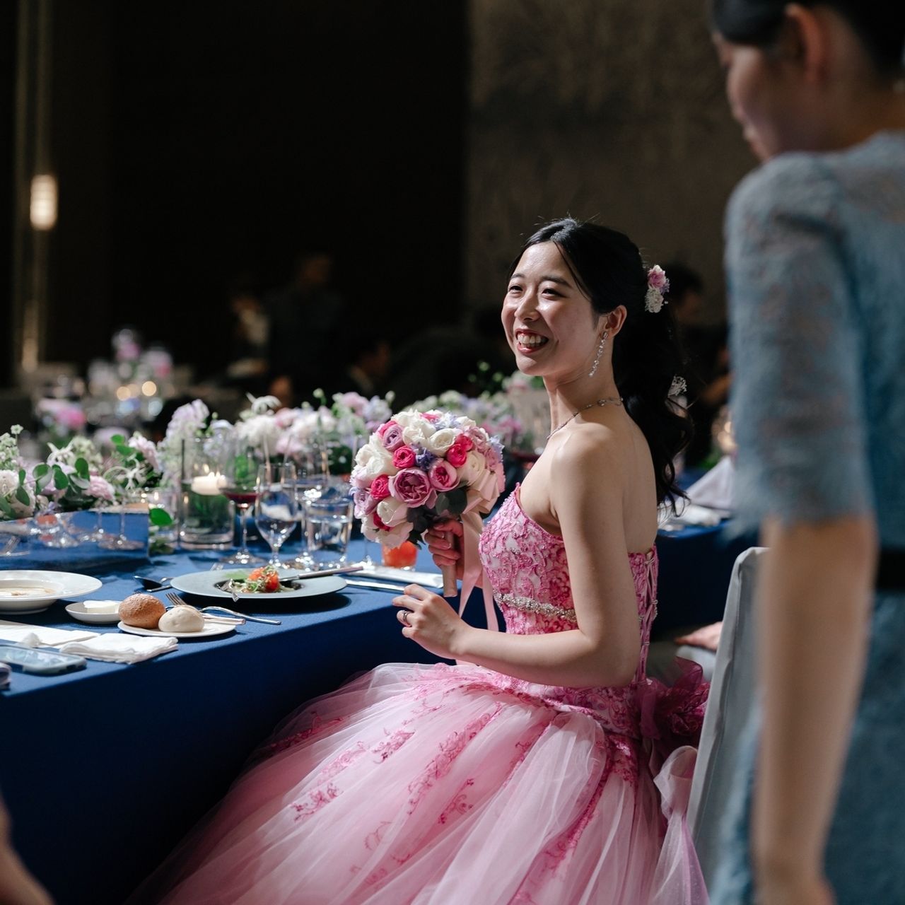またお皿やナプキン、テーブルクロスを選ぶ際に装花や絨毯の色と合うよう意識したことで、空間全体に統一感を出せたと思います。