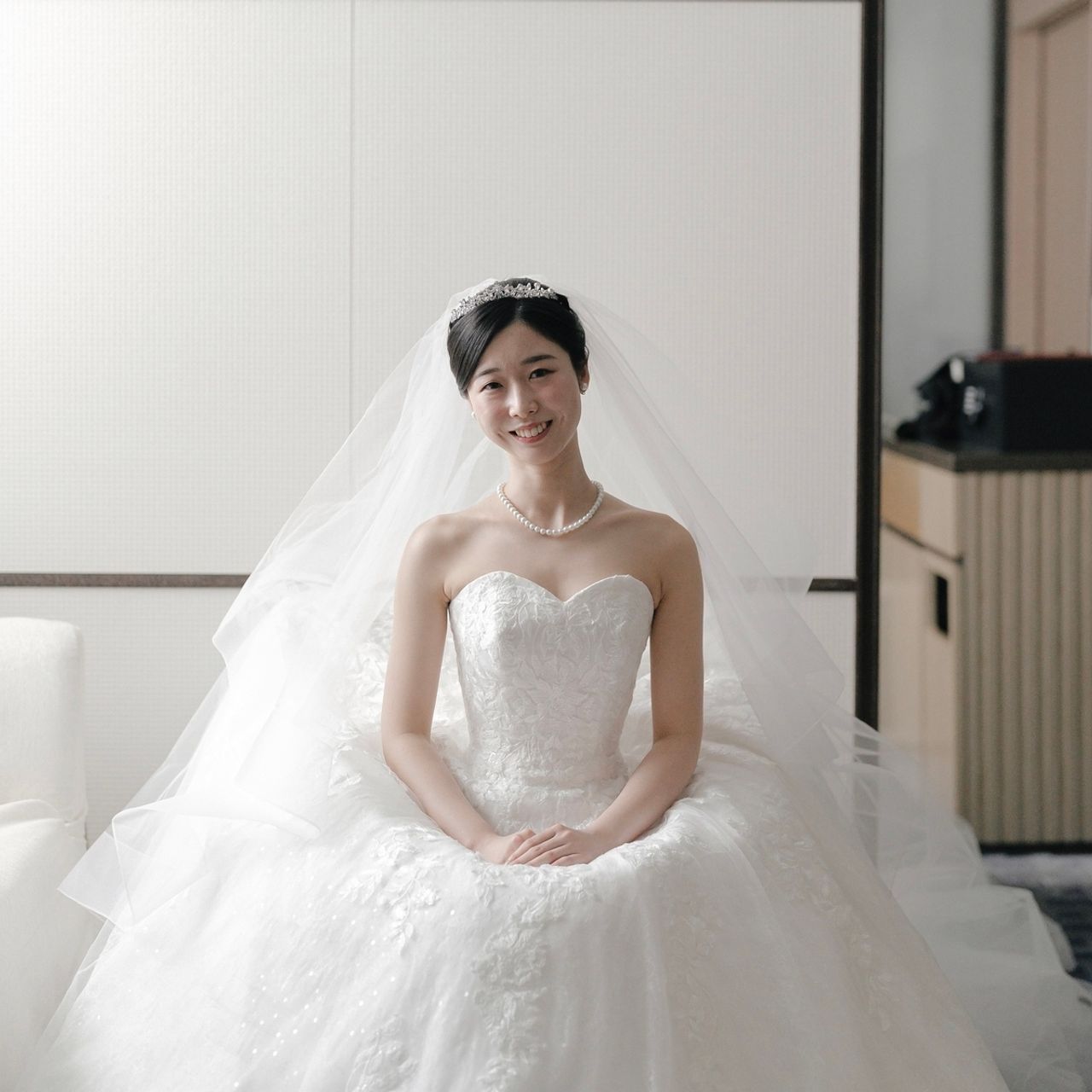 挙式、披露宴入場は王道クラシカルな雰囲気を出したかったので、艶感のある中間アップでティアラをつけました。