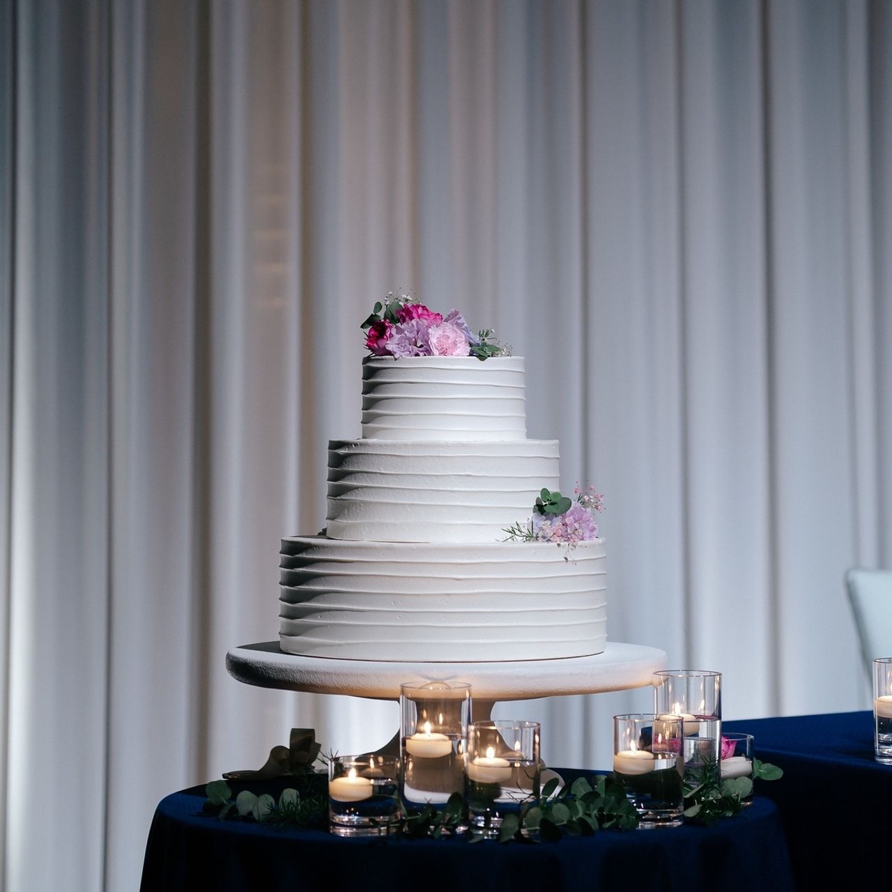 ナチュラルな雰囲気を出したかったので、シンプルなボーダーラインの三段ケーキにしました。ケーキにもところどころお花を飾っていただき、下部にはキャンドルを置いていただきました。