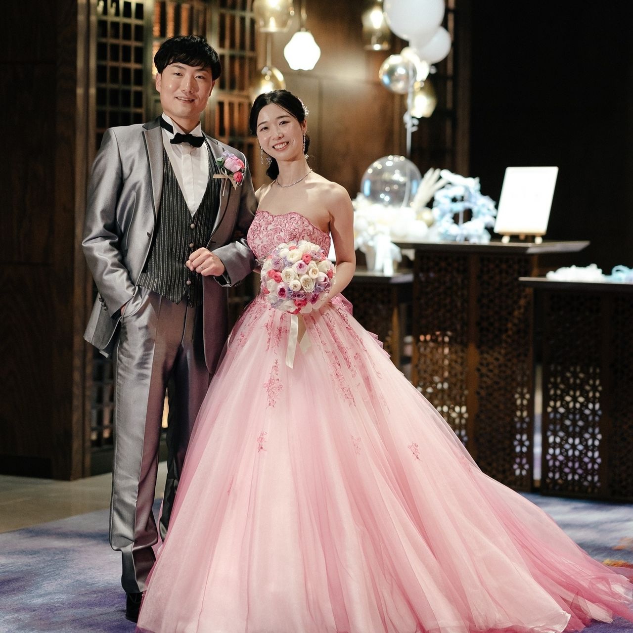 当日のドレスや小物にラベンダーはなかったのですが、会場の絨毯の色とカラードレスのピンクの中間色としてラベンダーを入れることで、透明感や抜け感を出したのがこだわりポイントでした。