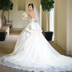 ウエディングドレスは、王道のウエディングドレスがよかったので、サテンで長いトレーン、そしてバックに大きなリボンが付いているものを探しました。