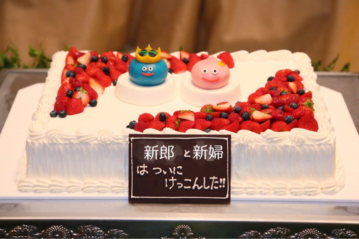 新郎がケーキ入刀の時にどうしてもドラクエのレベルアップ音を使用したいと言っていたので、ケーキもそのゲームに登場するキャラをマジパンで作ってもらい、スクエア形のケーキの上に乗せていただきました。