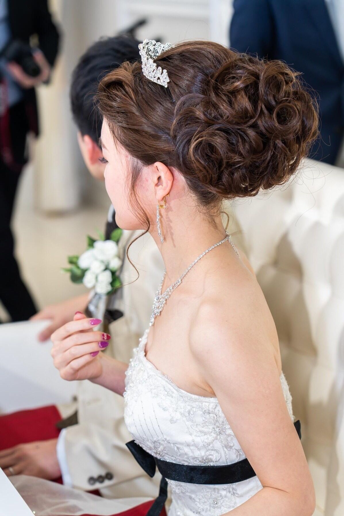 ・ウェディングドレスは、マーメイドだったので大人っぽく、かつこだわりの大きめティアラが目立つよう、後方にボリュームを出しました。