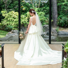 アイボリーのような色味とドレープになっているトレーンがお気に入りです。