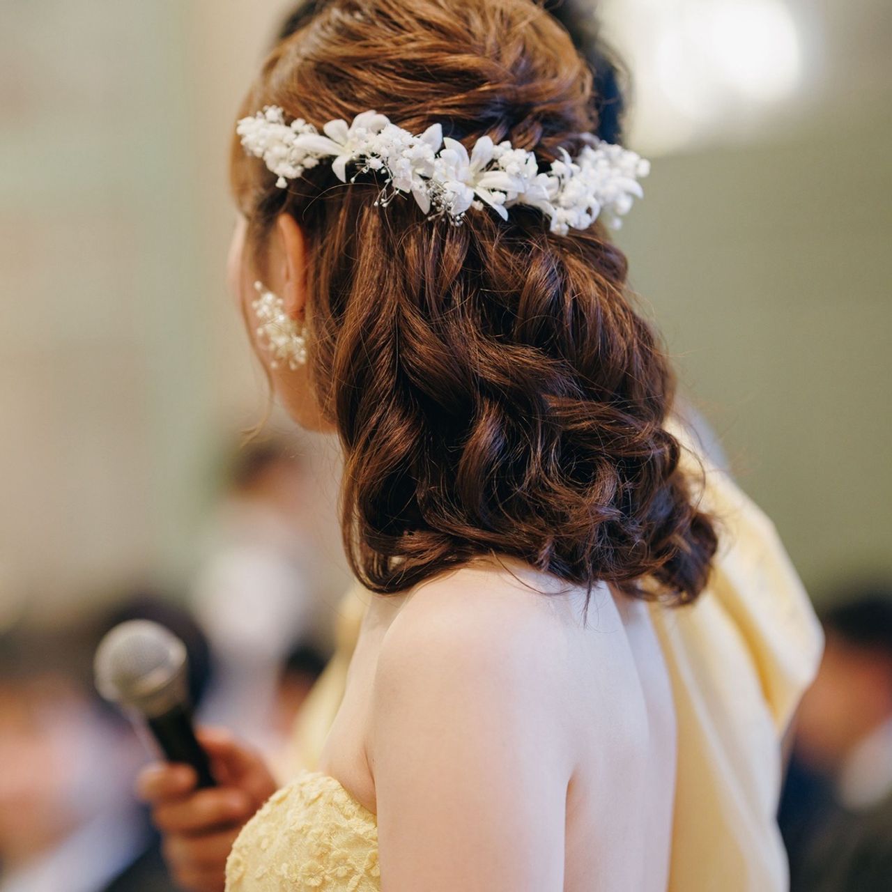 カラードレスではウェディングドレスの時との差をつけたかったことと、お友達の結婚式ではラプンツェルのような編みおろしタイプが多かったので、みんなとは違うハーフアップを選んでいます!