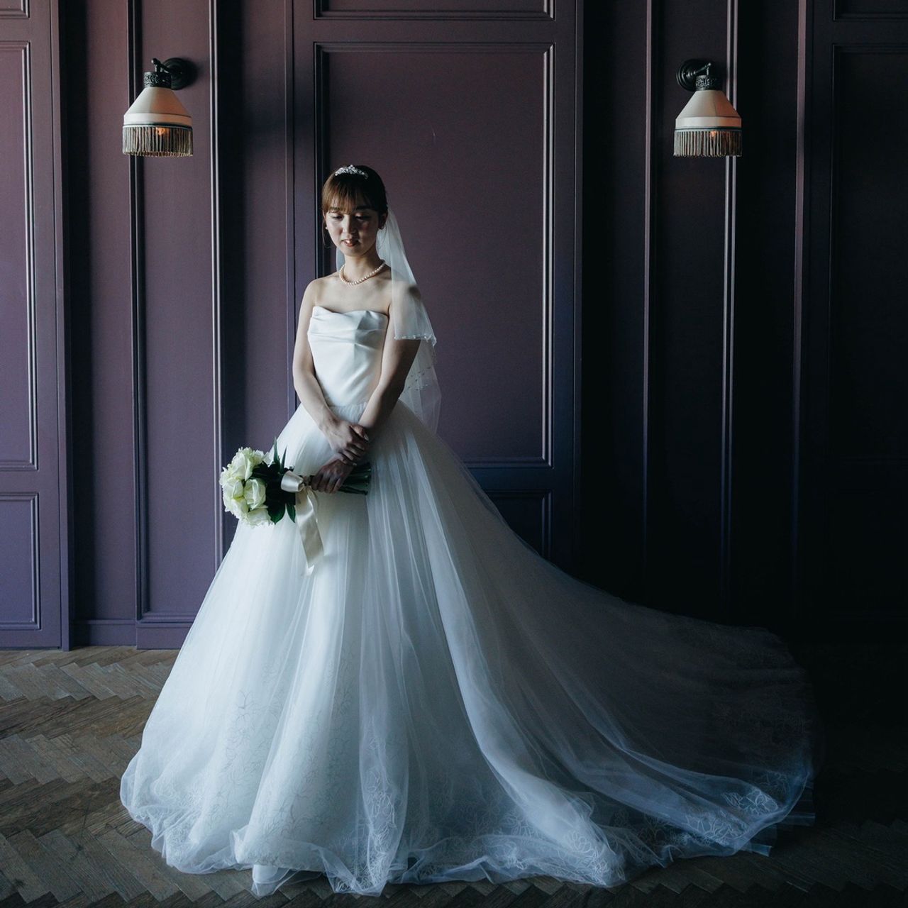 王道なプリンセスラインのウエスト部分と今時風なチュールのスカートに、裾部分にはお花の刺繍が入っていてとてもシンプルかつ繊細で一目惚れしました🫧