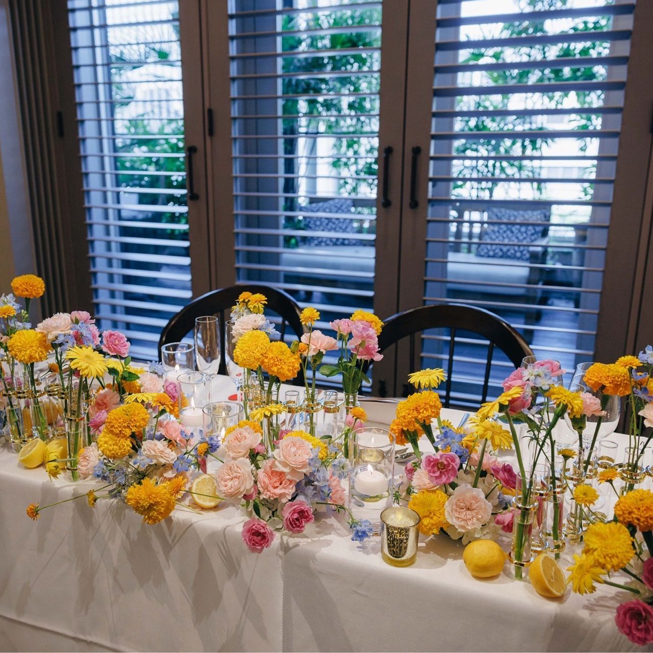 披露宴は本当にアットホームな明るい雰囲気にしたかったので、装花はオレンジと水色とピンクの明るいカラーでお願いしています。