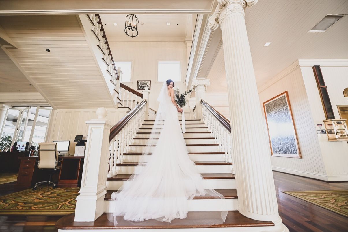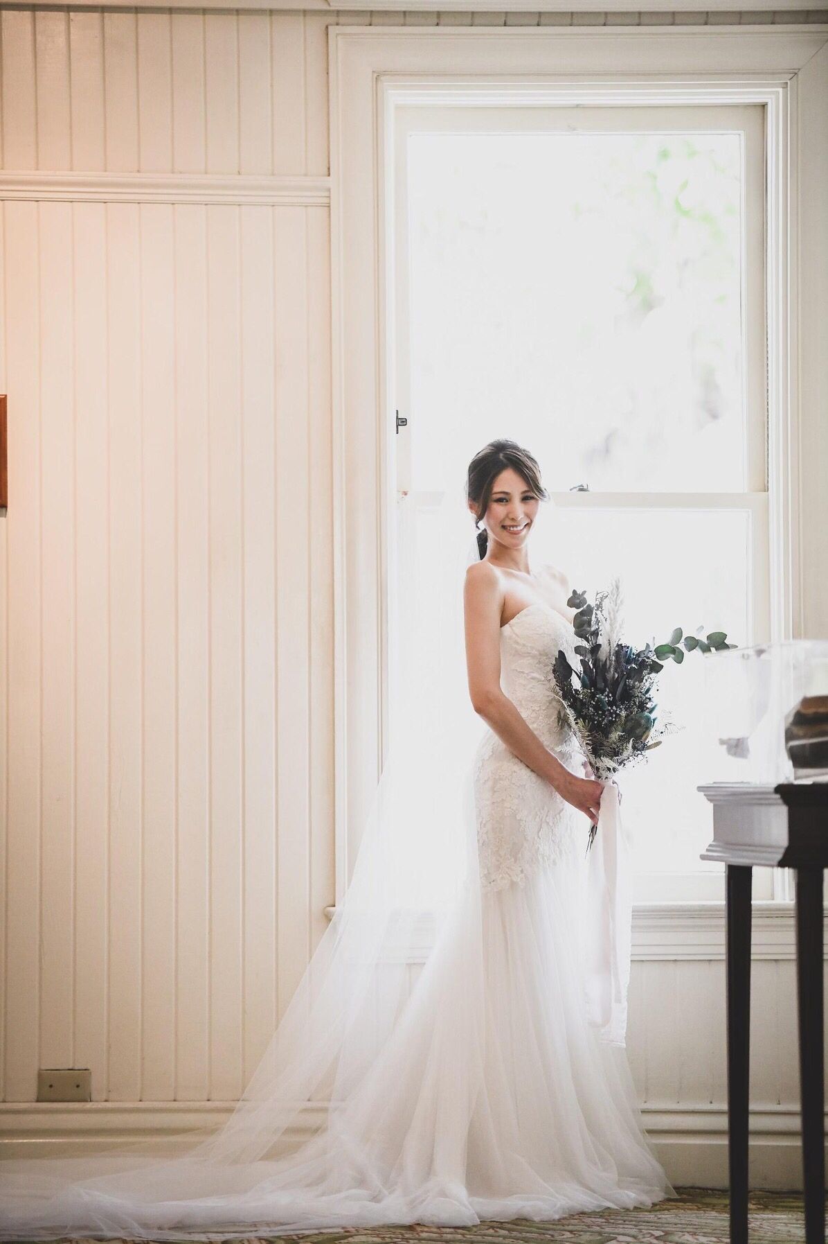 ロイヤルブルーのバージンロードに映えるように、トレーンの長い真っ白なマーメイドドレスを選びました。