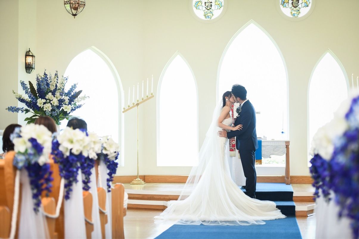 祭壇へと続く綺麗なロイヤルブルーのバージンロード、繊細なステンドグラスに見惚れながらゆっくりと歩きました。