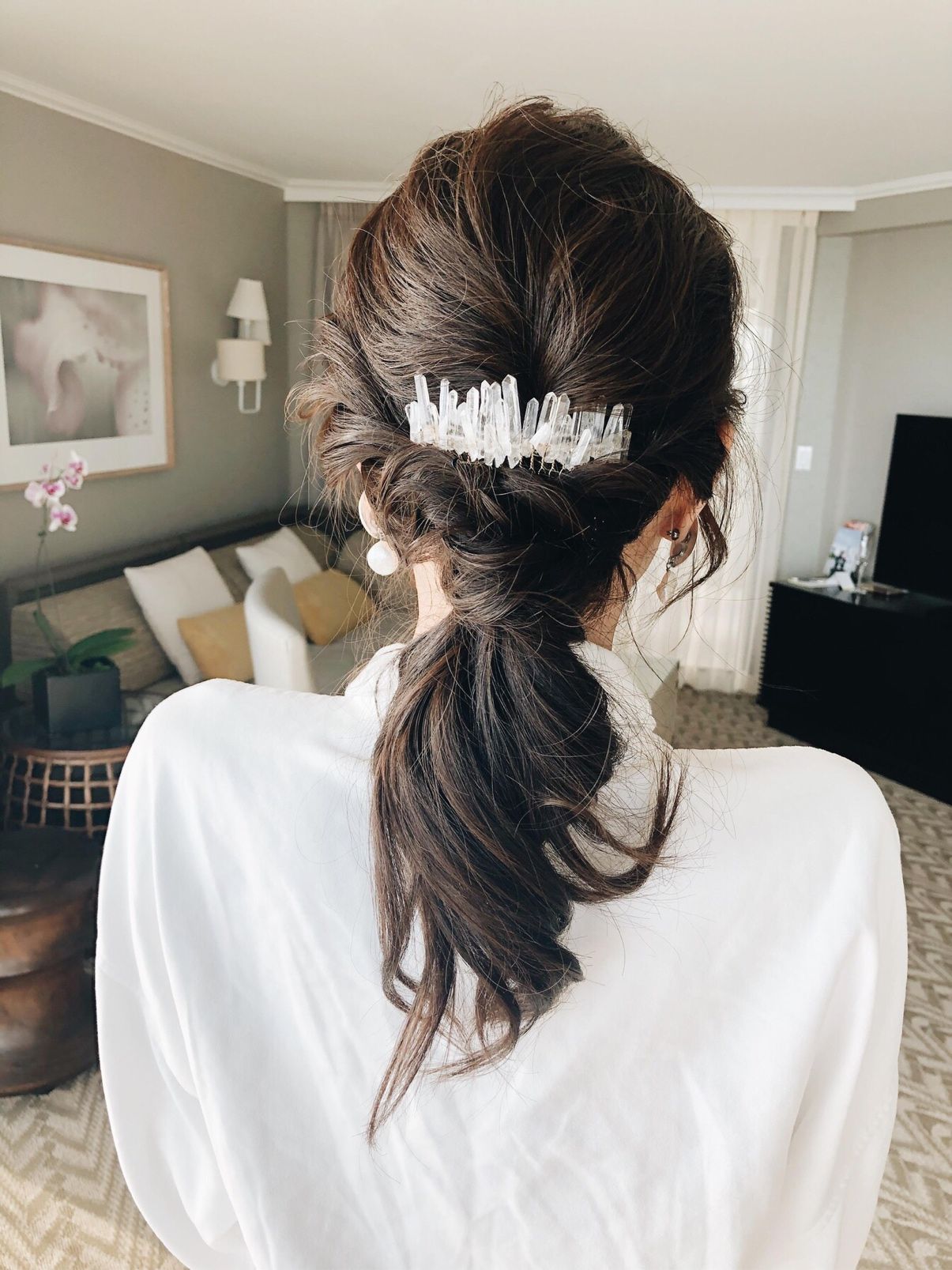ハンドメイドのクリスタルコームを付けました。