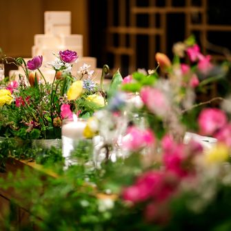 会場装花のテーマは春のお庭。庭園の桜を生かしつつ、春の色とりどりな雰囲気を大切にしました。