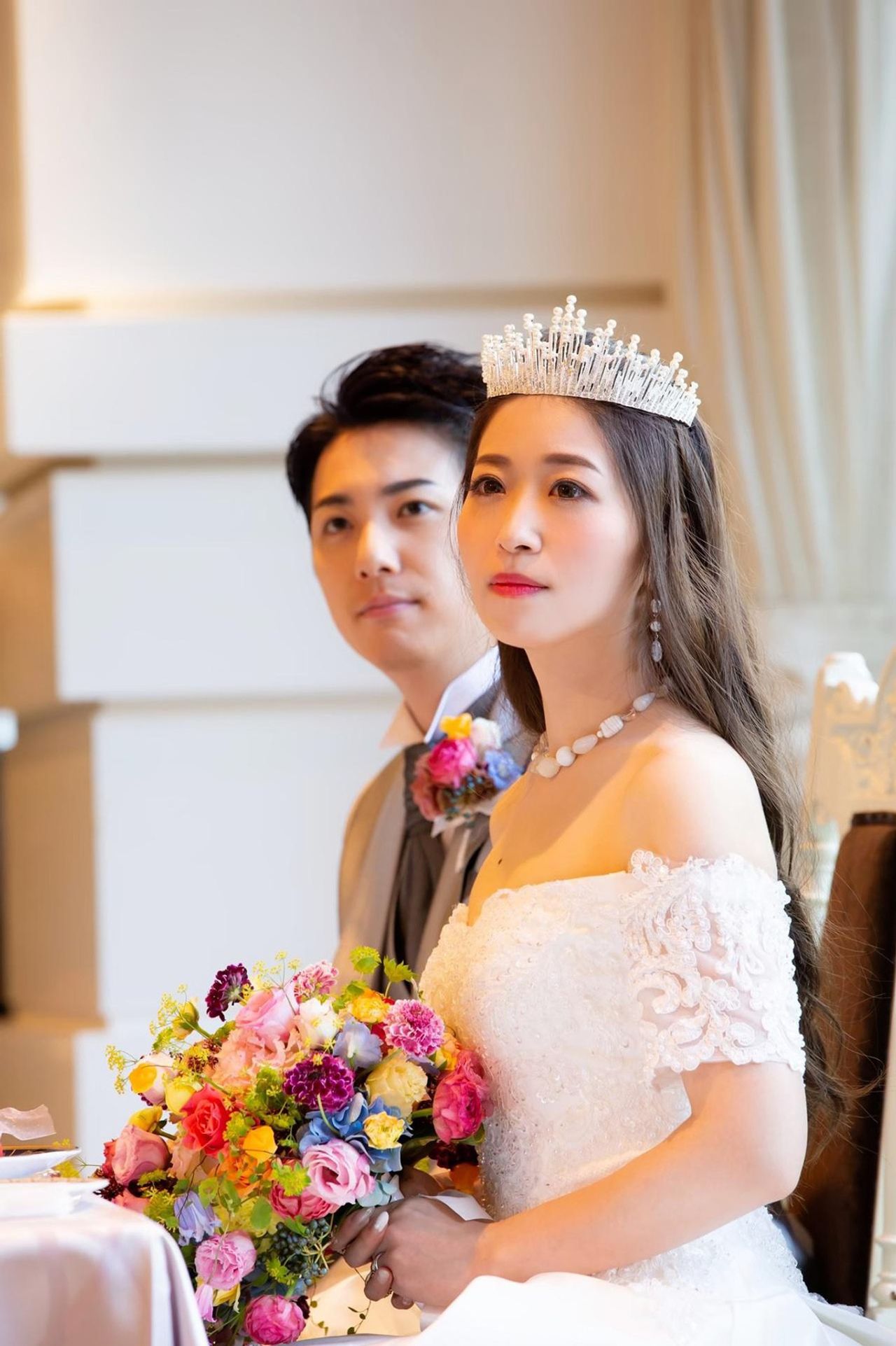 挙式・披露宴のティアラは、一目惚れしてネットで買ったものです!1700円でした(笑)プチプラだったのもあり、頼んでみて当日付けるか決めようと思っていましたが…届いて見てみると高見えして、素敵だったので当日も使用しました!ティアラというよりは、大きめでクラウン寄りだと思います!存在感があって、友人からもほめられました!