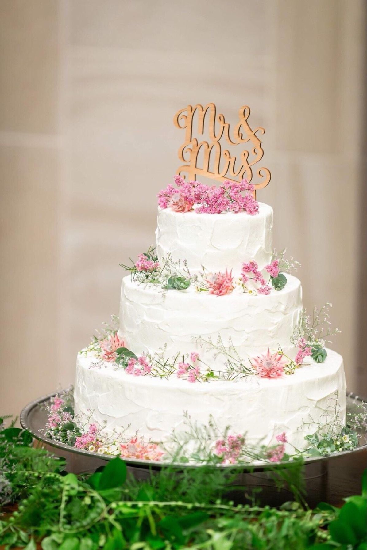 最初はシュガークラフトで花が立体的に乗っているものにしたかったけれどデザイン的に出来ないと言われ、ケーキ自体に生花が乗っているものにしました。