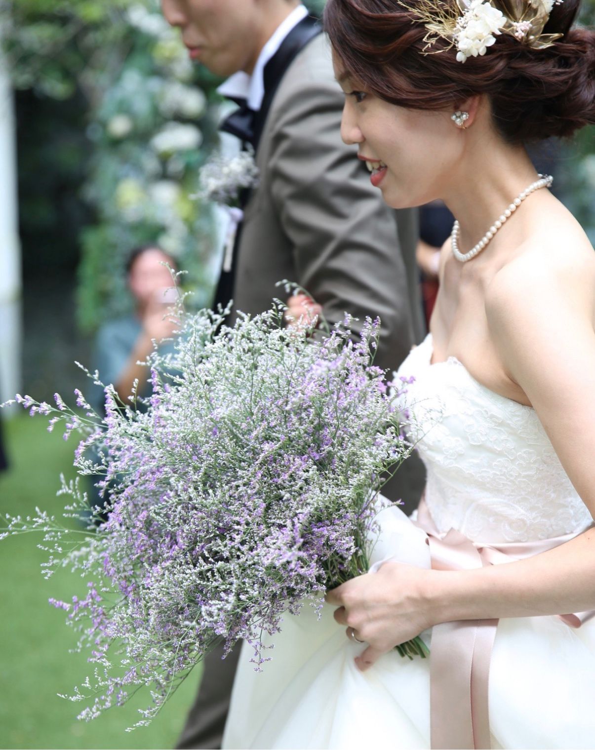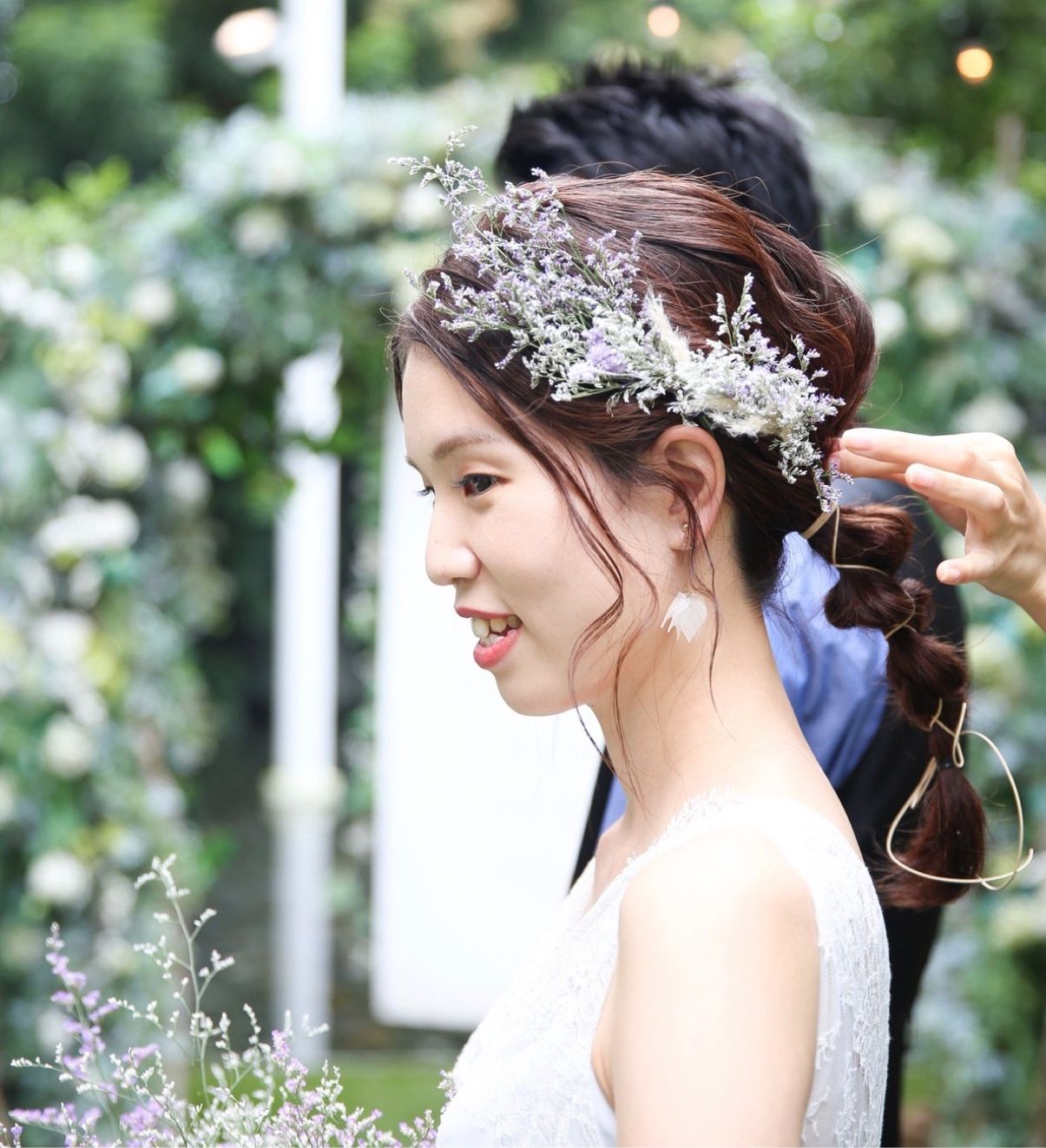 ブーケに合わせて花みちさんに作成して頂いたヘッドアクセサリーと、ブルーファンタジアを切ってピンで飾ってもらいました。