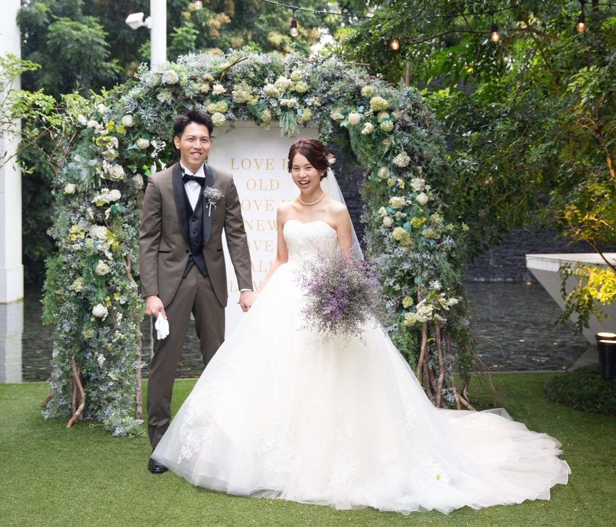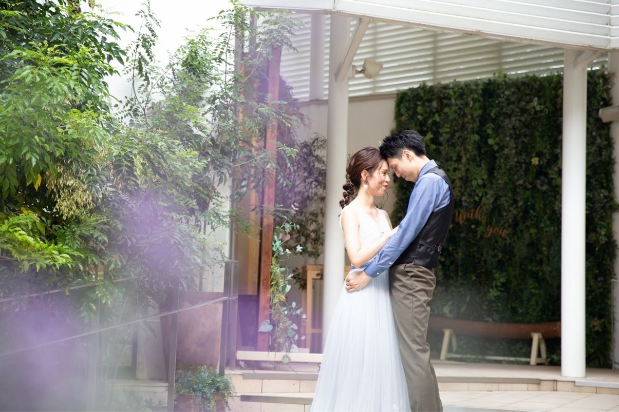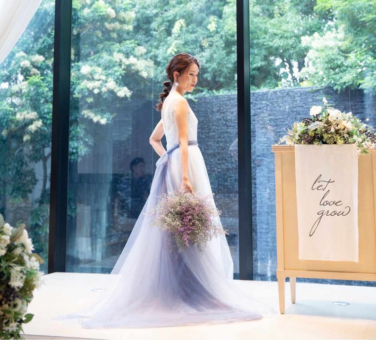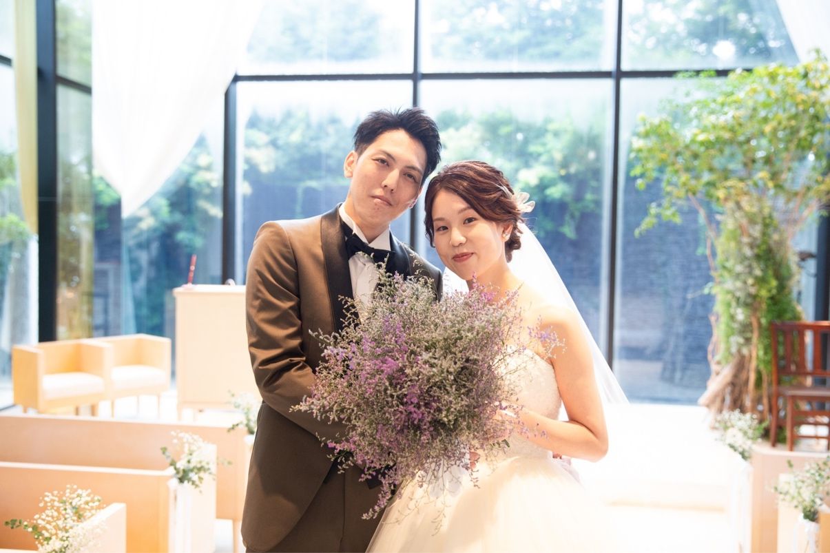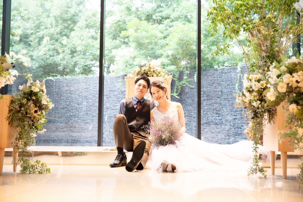 大きく開けたガラス窓からは光がたくさん入り、明るく開放的な空間です。チャペルの中から見える外の様子も、壁面から水が流れていたり、グリーンが綺麗に装飾されていたりと、ナチュラル婚を目指していた私たちにはぴったりの空間でした!