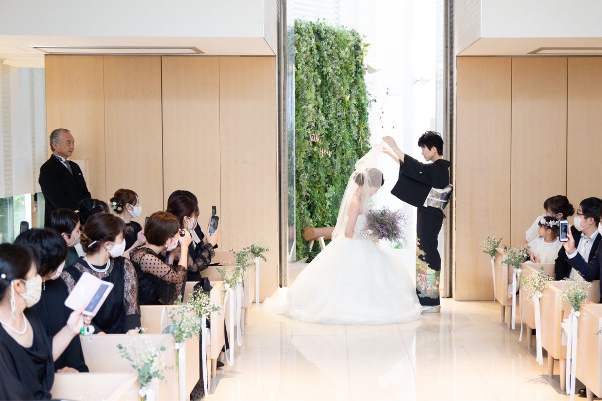 挙式時のベールダウンの際、母親からのハグが一番印象的なシーンでした。その時は笑顔で入場したかったので、泣かないように必死でしたが、今思えば泣いてもいいからもう少しあの時間を味わっていたかったなと思います。