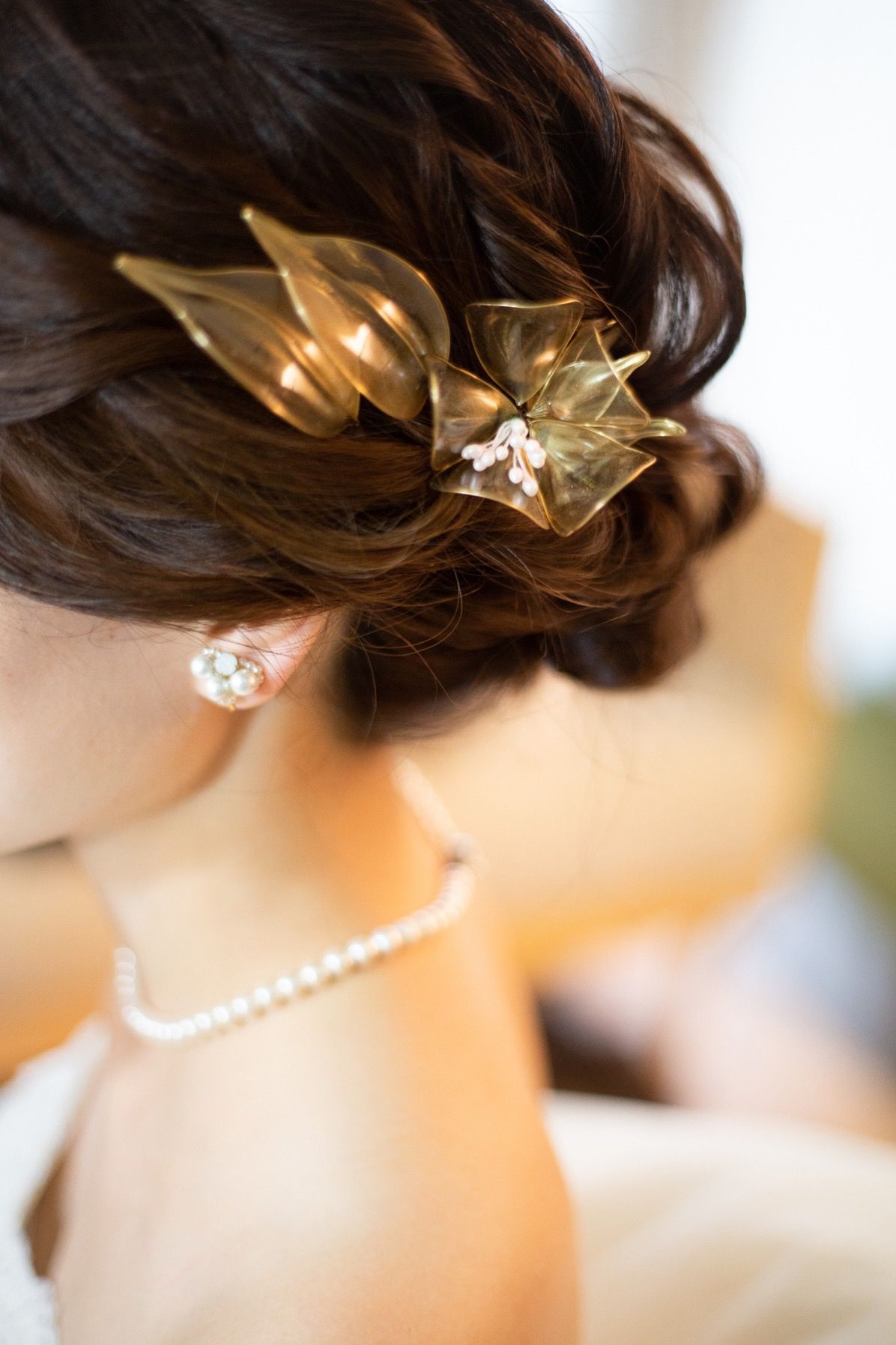 ドレスの柔らかい雰囲気に合わせ、友人手作りの透明感のある貝殻のような白いイヤリングを着用しました。
