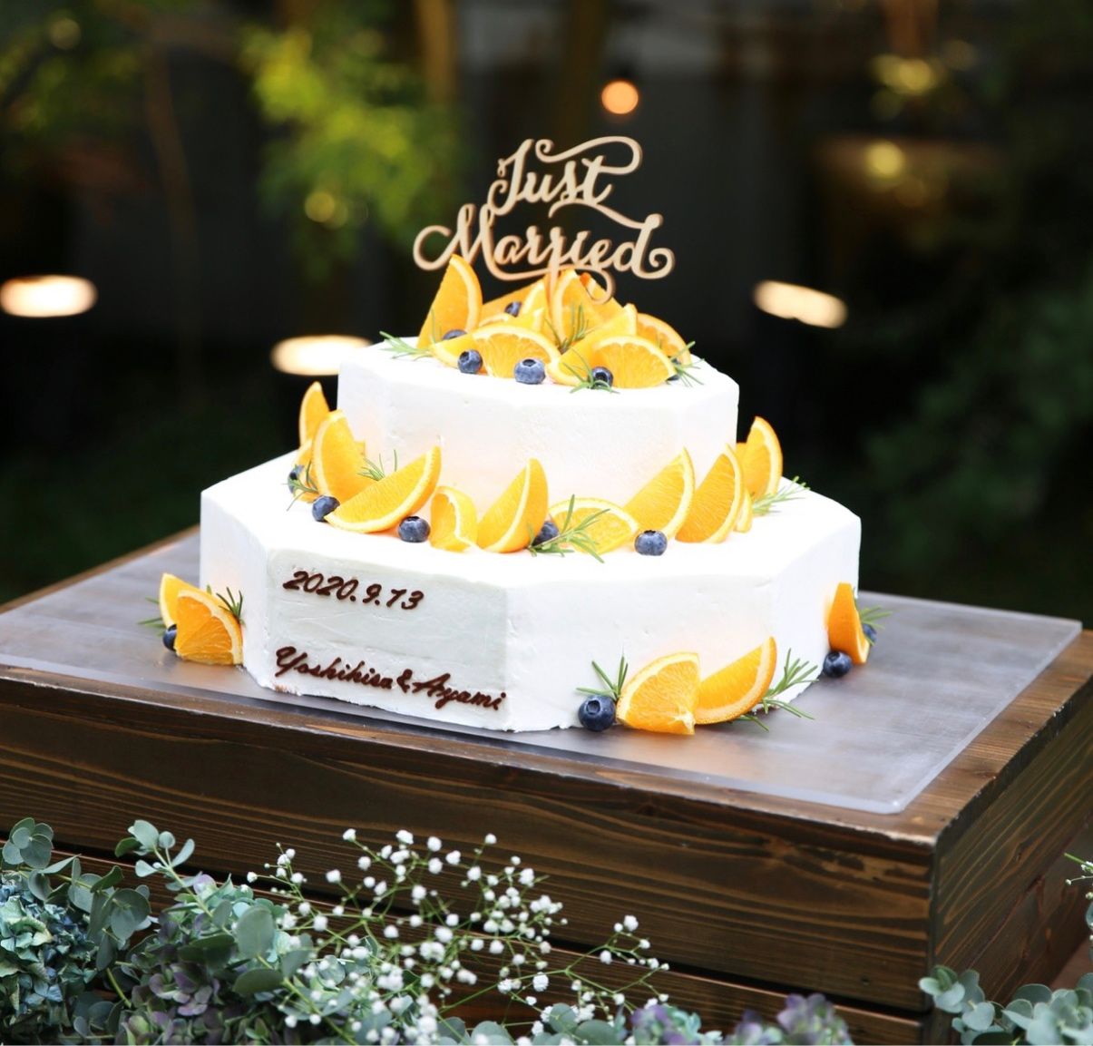 お付き合い8周年ということで、八角形のケーキを作成していただき、オレンジ等の爽やかなフルーツとローズマリーでデコレーションしたケーキにしました。