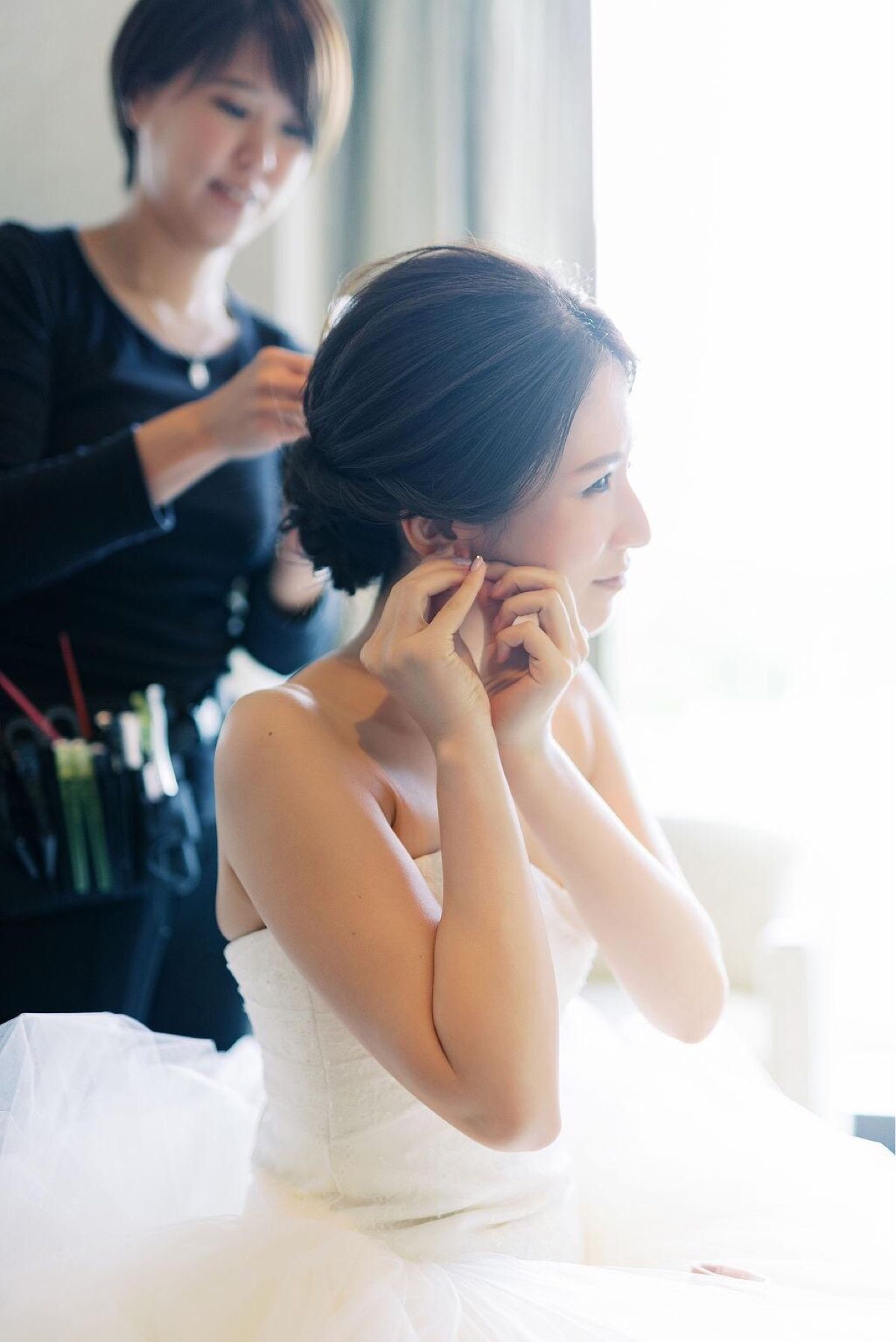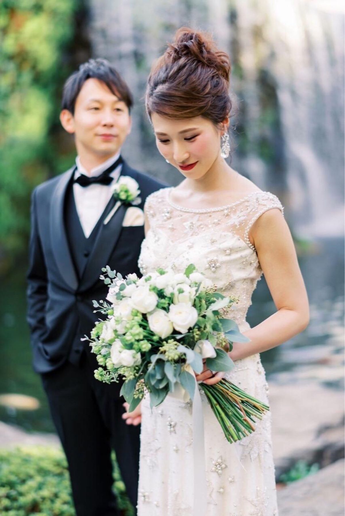 お色直し後のJenny Pacham Joleneには、Elizabeth Bowerの Sakura Dew Dropをアクセサリーとして選びました。大振りのスワロフスキー製のクリスタルがキラキラと耳元で揺れ、これ一つでドレスが格段に華やかになりました!