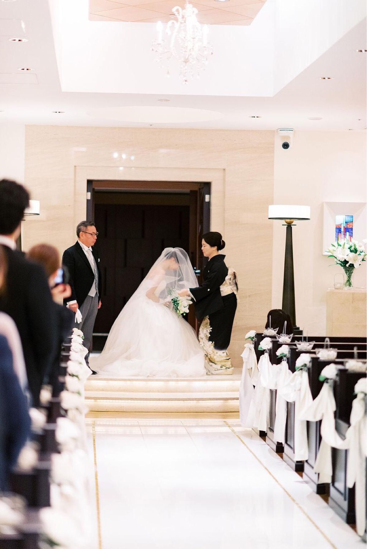 挙式はプリンチパーレというイタリアの修道院にデザインをならったチャペルで行いました。聖歌隊と生演奏のピアノの入場曲に、柔らかな光が差し込んむクラシックな空間で感動的な時間を過ごすことができました。