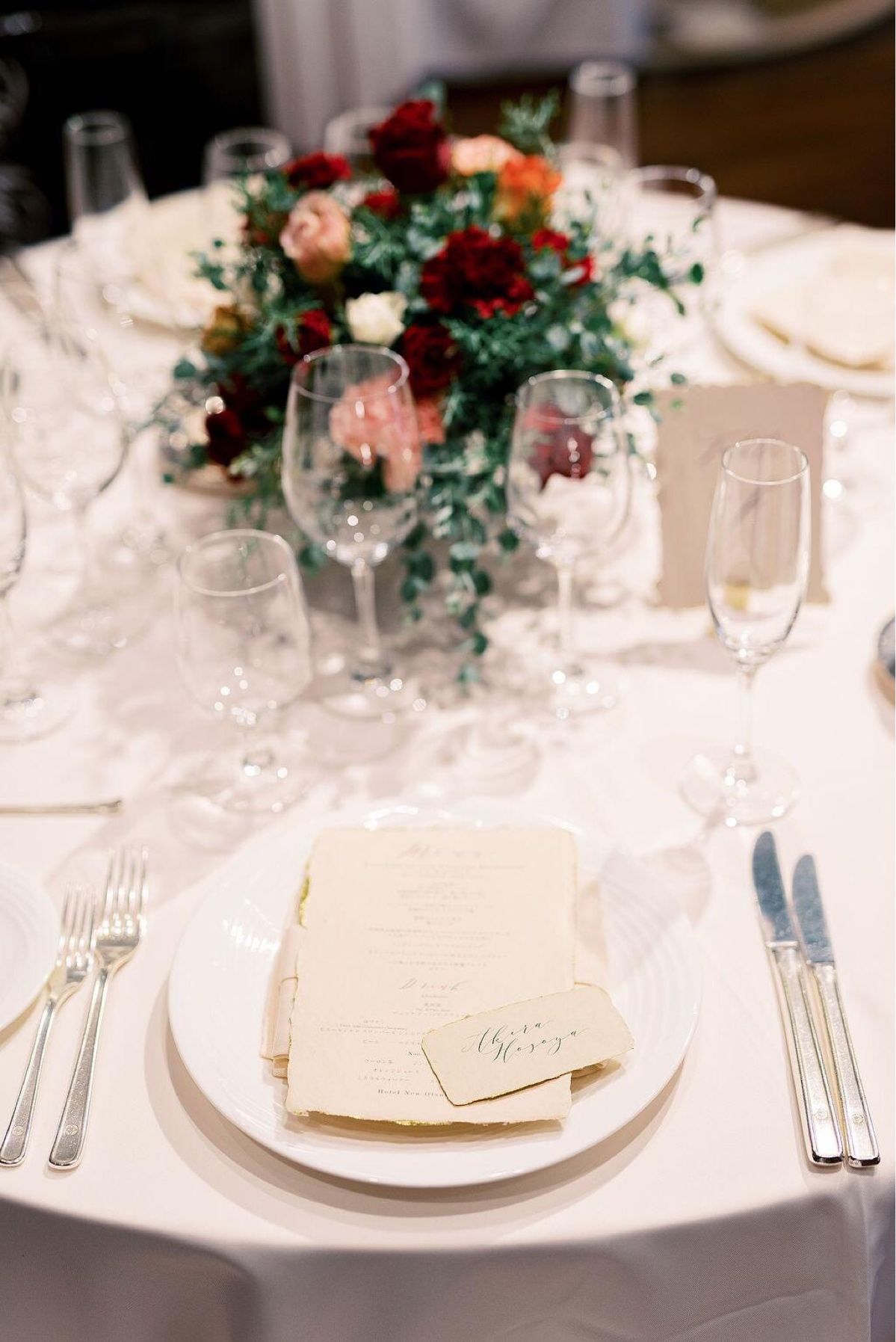ゲストへ私たちのメッセージをお花で楽しんでもらえるよう感謝を込めて、 ダリア(感謝)、レオニダス(恋、愛)、ユーカリ(想い出)の3つのお花を中心に、秋らしい濃いめ赤、薄いベージュのカラーで装花を作ってもらいました。