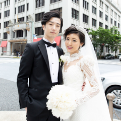 クラシカルにしつつ、まとめすぎず手ぐし感を残したアップ。パール&スワロフスキーのティアラを合わせ、エアリーエレガントな美しいスタイルにしていただきました。
