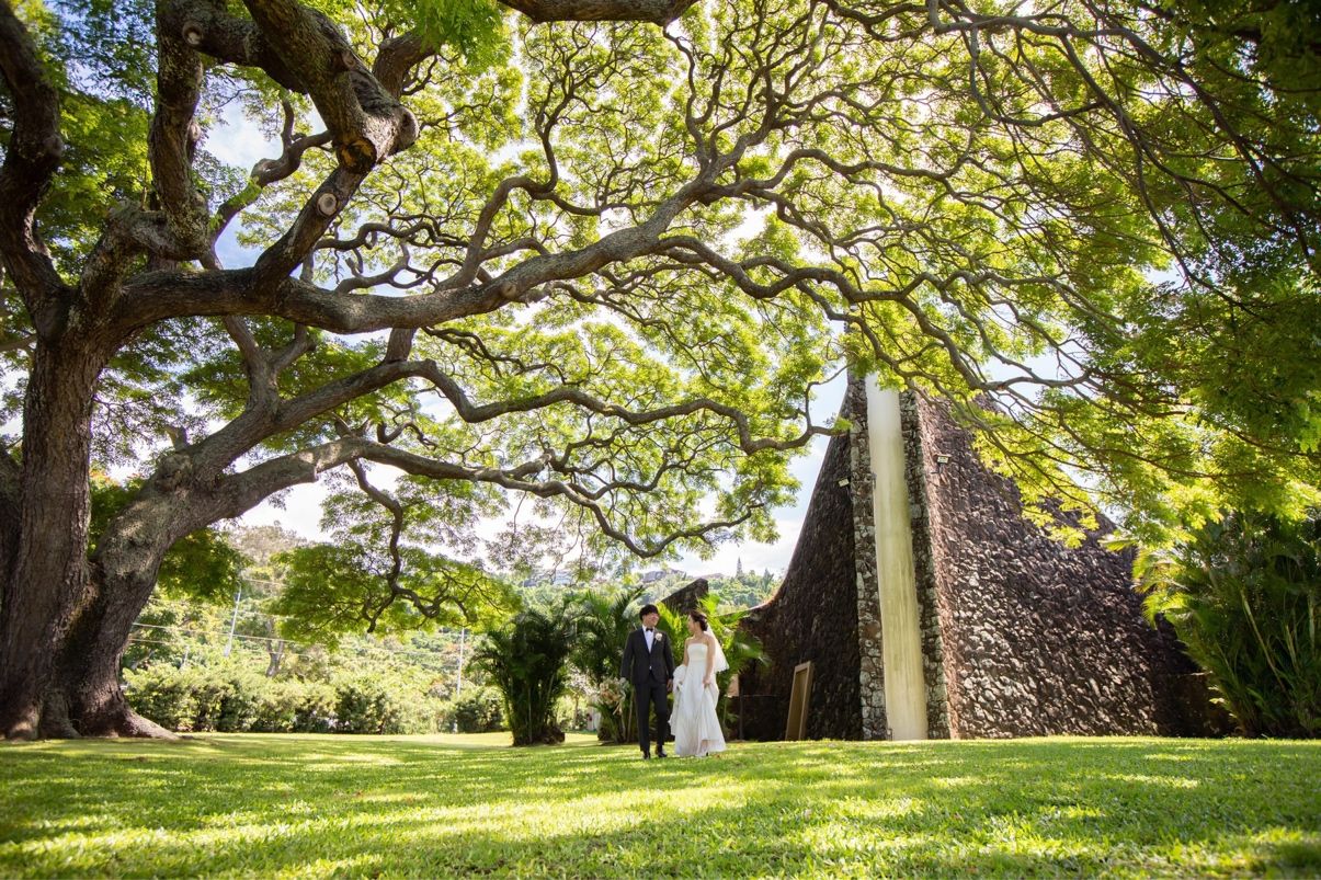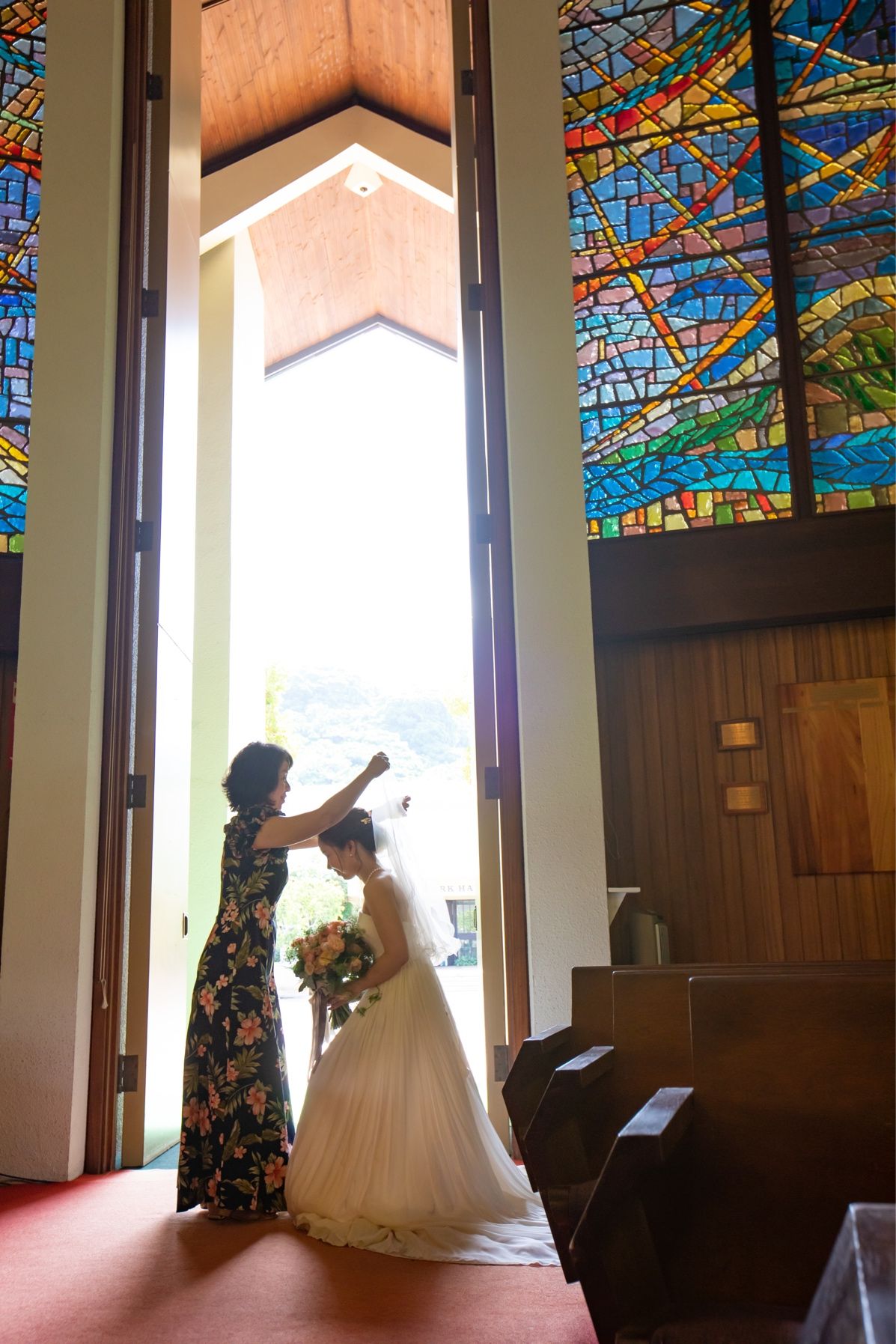 包容力のあるウッディな教会で、振り返るとハワイの自然をモチーフにしたステンドグラスが♡赤いバージンロードもドレスのトレーンが映えてとても素敵です。教会まわりはグリーンの庭が広がり、いろんなパターンの写真が残せました!