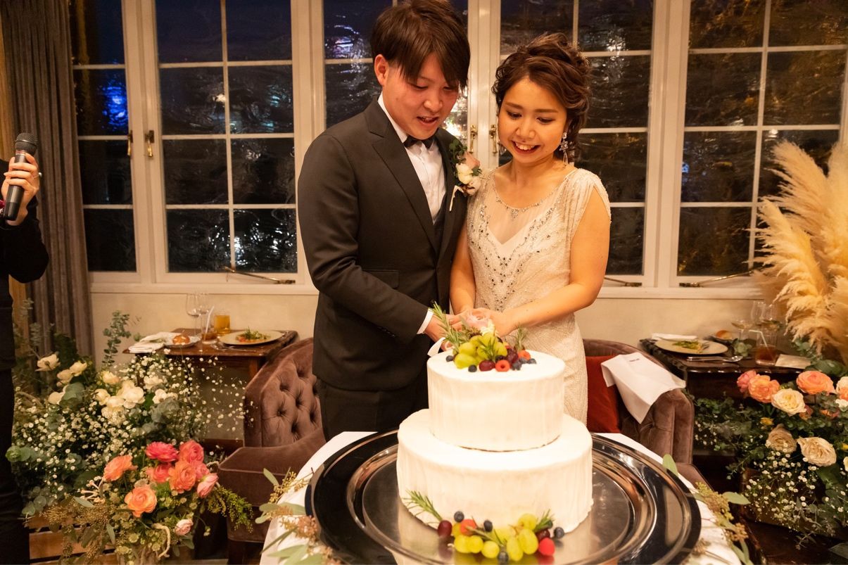 飾りでのこだわりは、ストライプに塗ってもらったクリームと中のスポンジとクリームをチョコレートにしてもらったことです。というのも、コースデザートのクレームブリュレがおいしくて、そのバランスと、チョコレートのウェディングケーキは、わたし自身今まで出会わなかったのでサプライズになるかな、と◎
