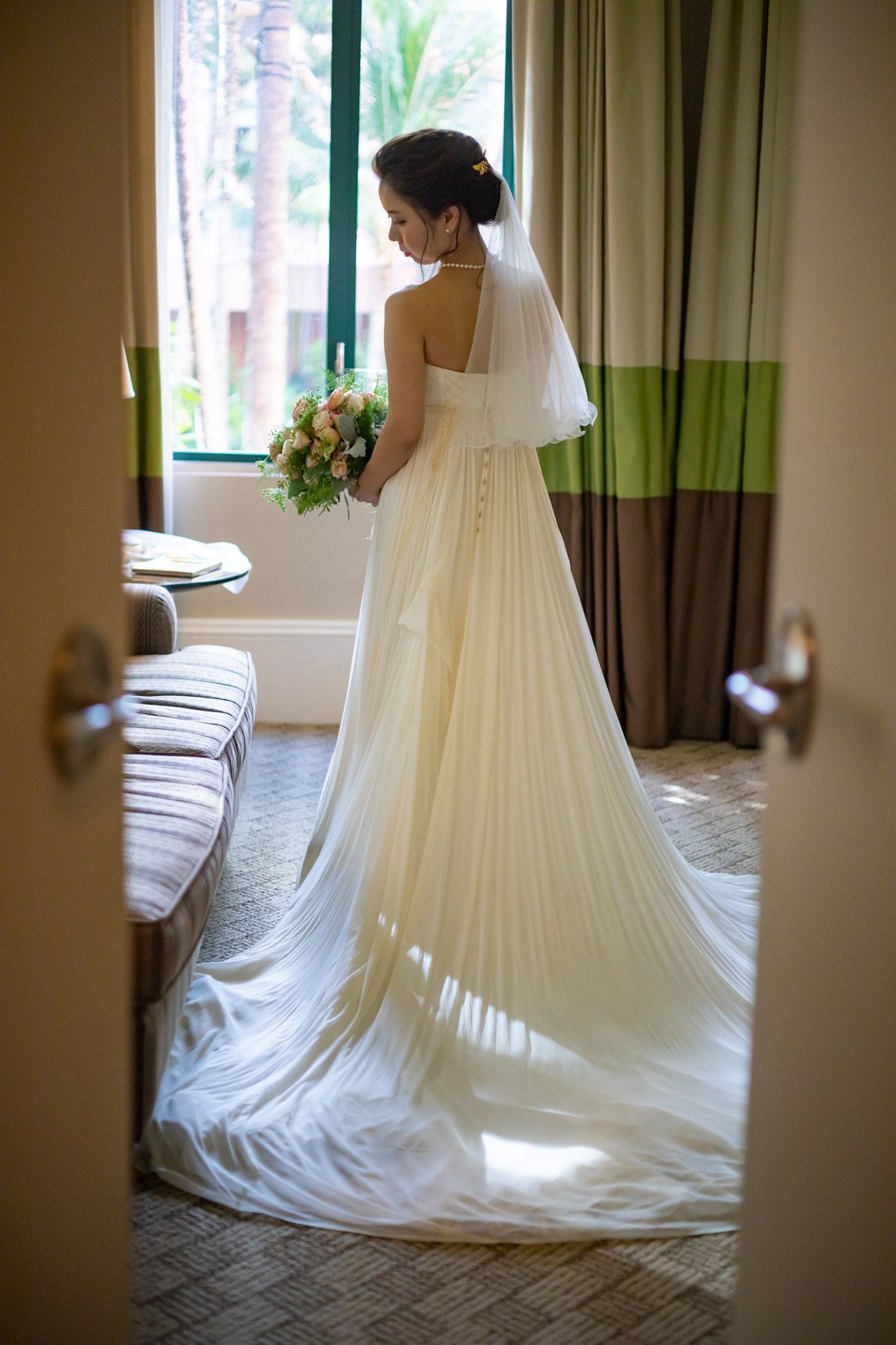 1着目:ハワイ挙式とのつながりを作りたく、ベールを後ろにつけました