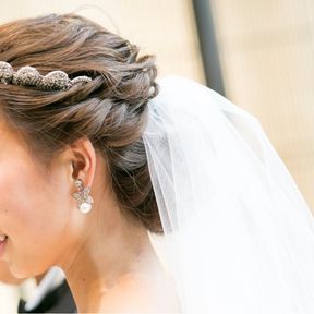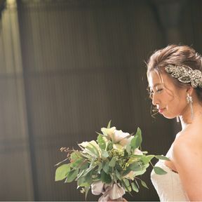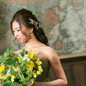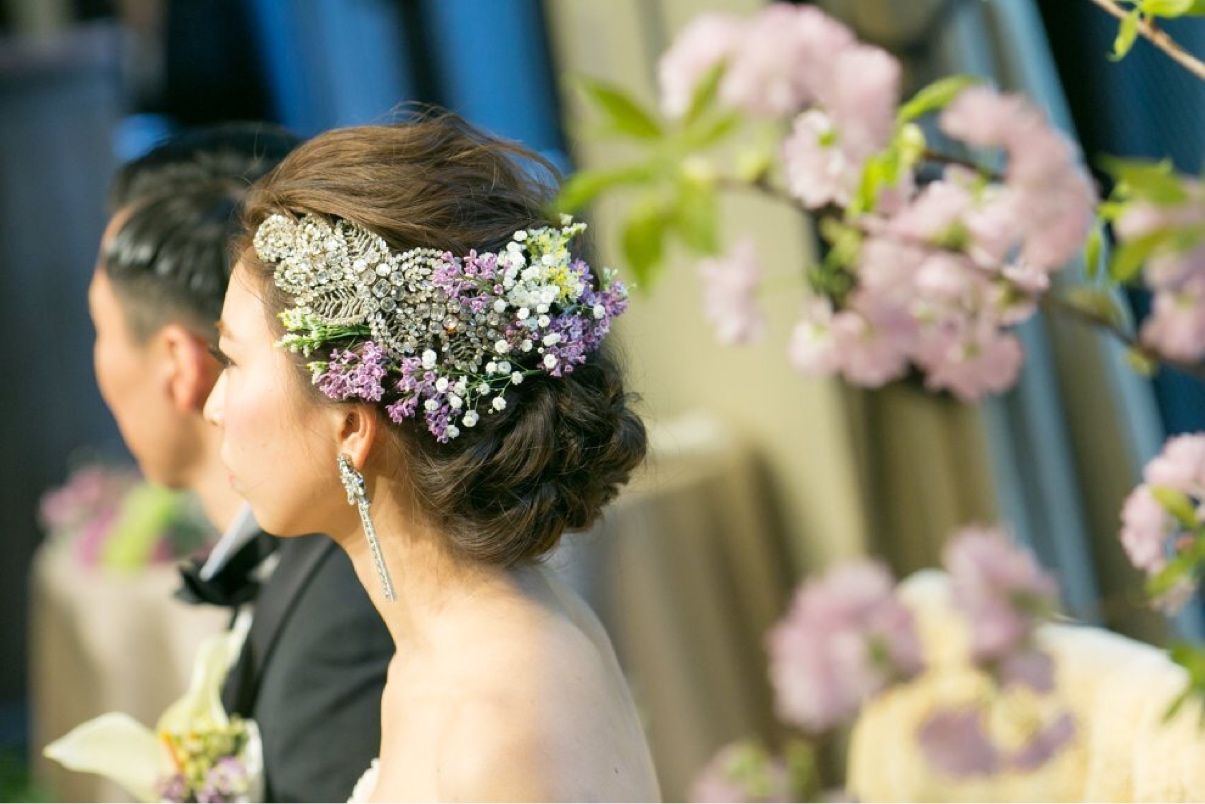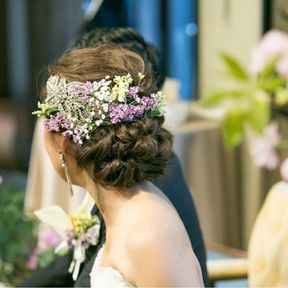 シンプルなマーメイドドレスだったので、ジェニーパッカムのボンネに小花をミックスさせ、ヘアにボリュームを出しました✨