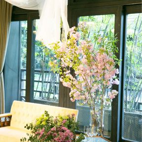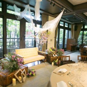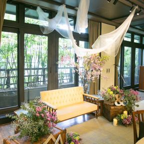 窓一面ガラス張りで外には中庭から生える竹林も見え、高砂での写真の背景はグリーンが映えます。