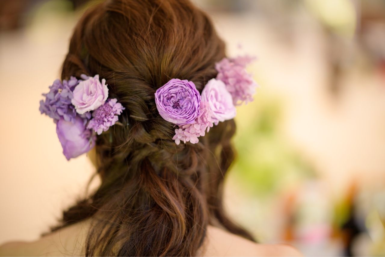 食事会のハーフアップはブーケとともに自作したプリザーブドフラワーのヘアパーツを使用しました。