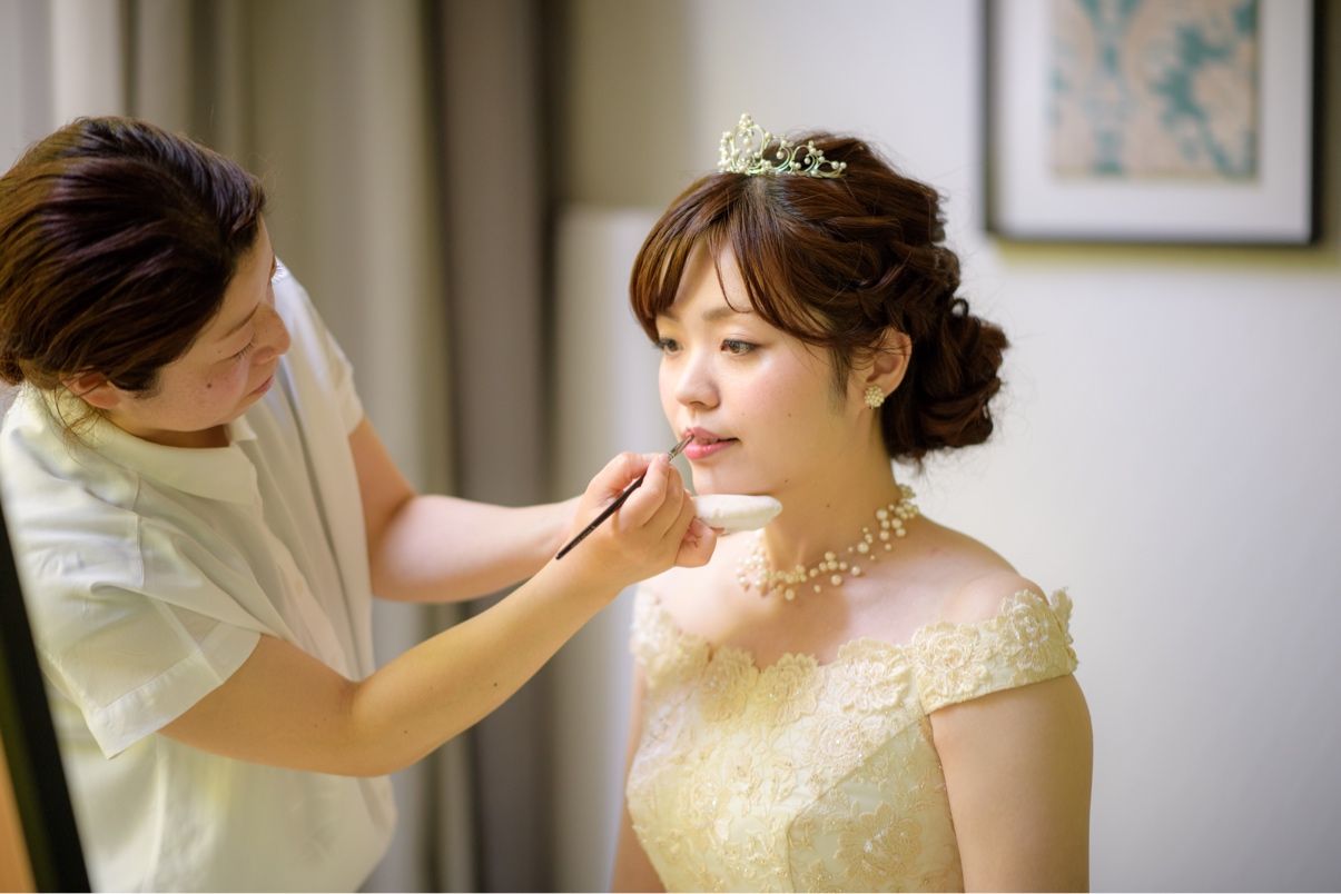 メイクに関しては優しい雰囲気の色味で仕上げていただきました。目元がぼんやりしてしまうので少しはっきりするようにしあげていただきました。