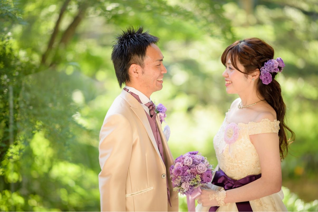 パープルは二人が好きな色で、食事会時のブーケ(自作してます。)やサッシュリボン、新郎のベストなどに取り入れました。