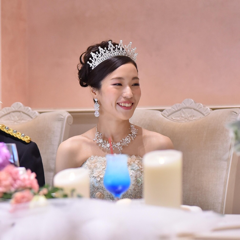 お色直しは、1着目から変化をつけたかったので、アップにしてお花の形の髪型にしました。王冠のような大きなティアラをつけて階段入場をした時は、私はプリンセスなんだなと、少し思っていました。それくらいカラードレス2着目は拘りました。