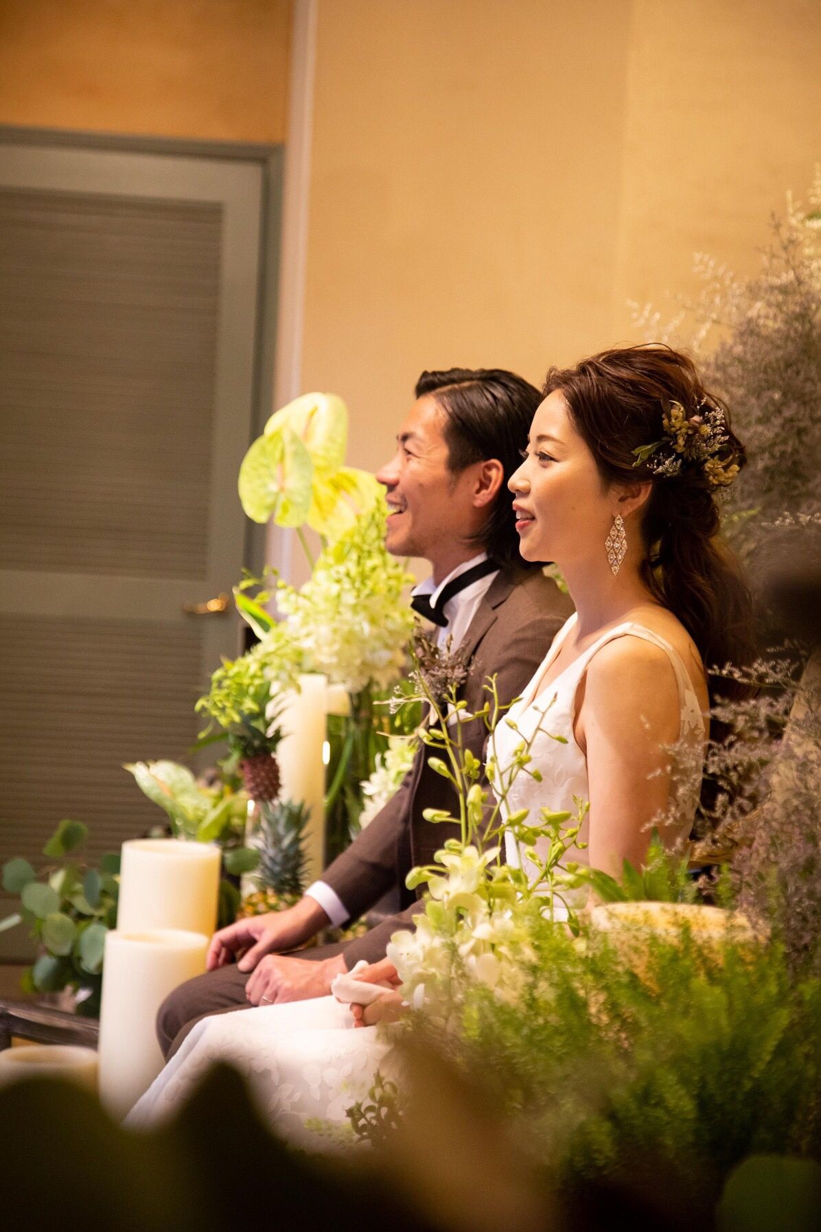 新設されたキャンドルが幻想的なチャペルに、目の前が海!という最高のロケーション。ゲスト席も珍しい半円状で距離が近く感じられて良い雰囲気で祝福してもらえました。