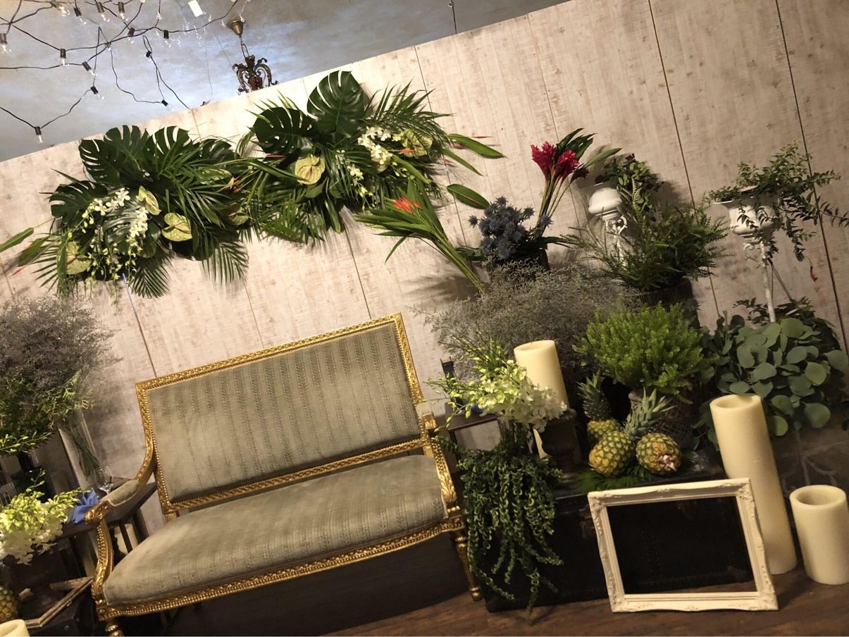 ゲストテーブルには、花パインと、果物のパイナップルを。高砂には極楽鳥花や、南国のグリーンをつかってもらいました。
