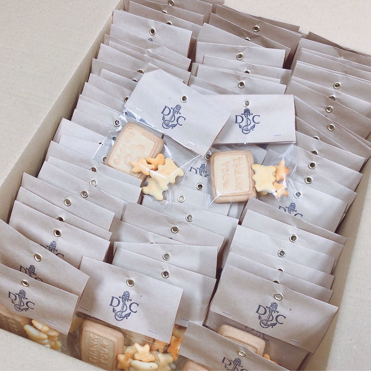 thank youクッキーと、星型お菓子チーズ味と、ピザ味お菓子詰め合わせ。イニシャルスタンプでオリジナルタグをつけました。