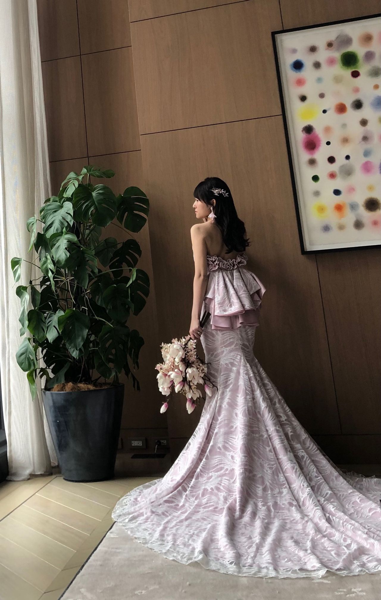 メリーマリー(提携外)のオリジナルオーダードレスです。最高級のリバーレースを使った世界に一つだけのピンクのマーメイドドレスです。