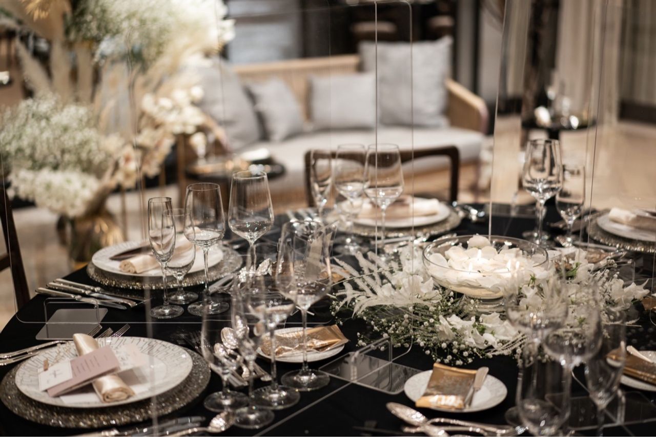 ここの照明がお花みたいな雲みたいな可愛い形をしていてお気に入りです!そして、ミラーが高砂装花を反射して倍あるように感じるのでお得だと思います🙆🏻♀️壁のブラックの縁取りが結構印象的なので、ごちゃごちゃし過ぎないようなテーマカラー選びを心がけました。