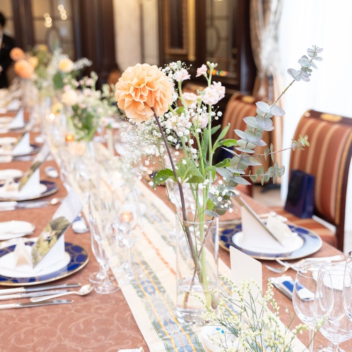 装花はお花のボリュームを抑えて、キャンドルや小瓶を組み合わせることでそれっぽくなるように調整してもらっています。