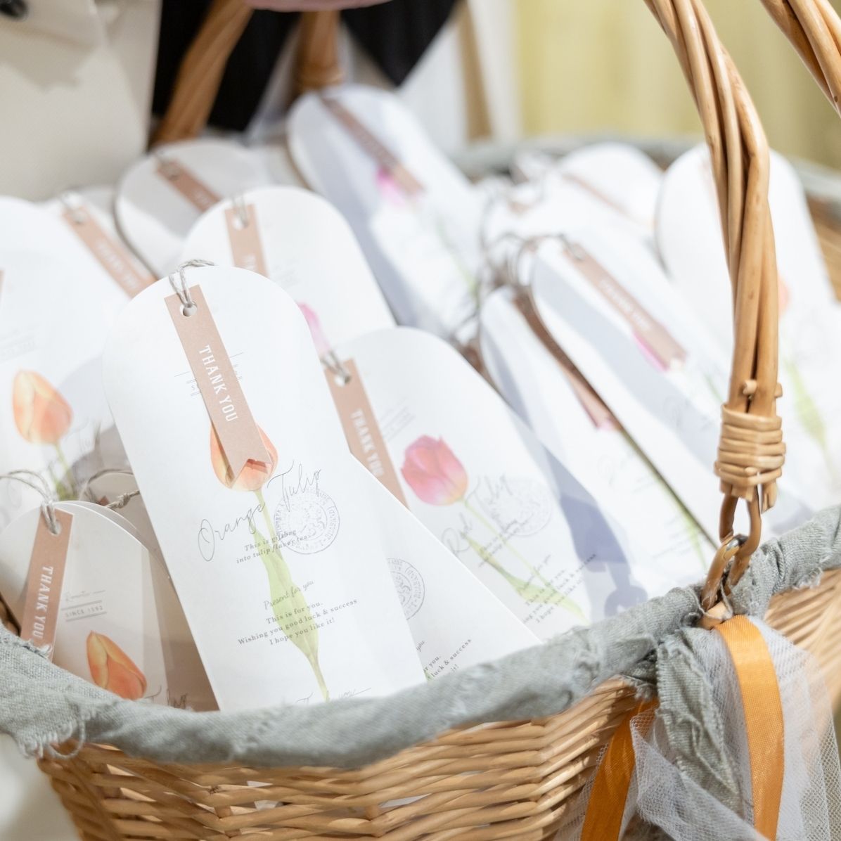 あとは、披露宴で使用したお花をフラワーデコレーターさんがミニブーケにしてまとめてくれたので、女性ゲストを中心にプチギフトと一緒にお渡ししています。