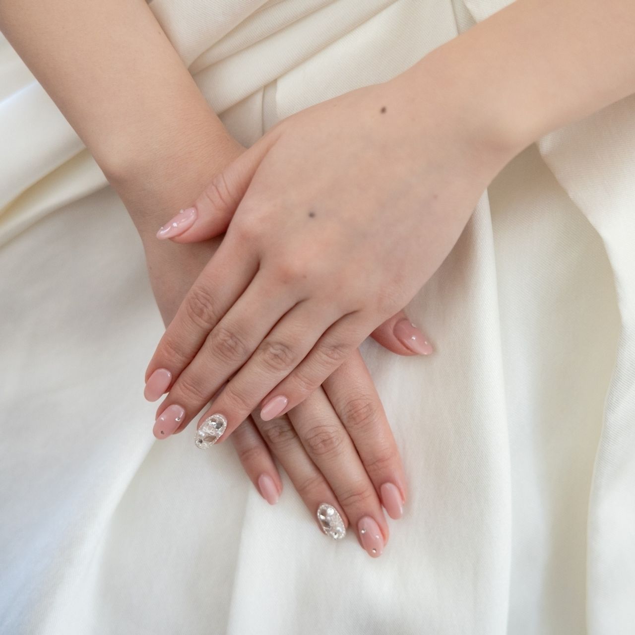仕事柄、派手な色はできないので、ピンクをベースにキラキラビジューとパールをのせてもらっています。