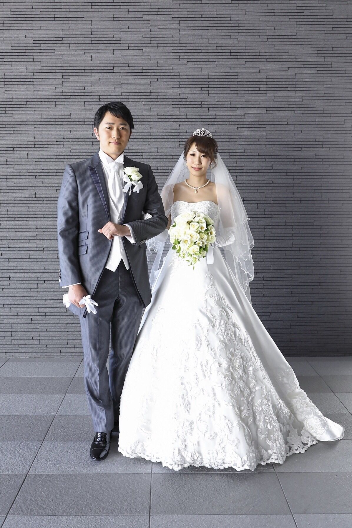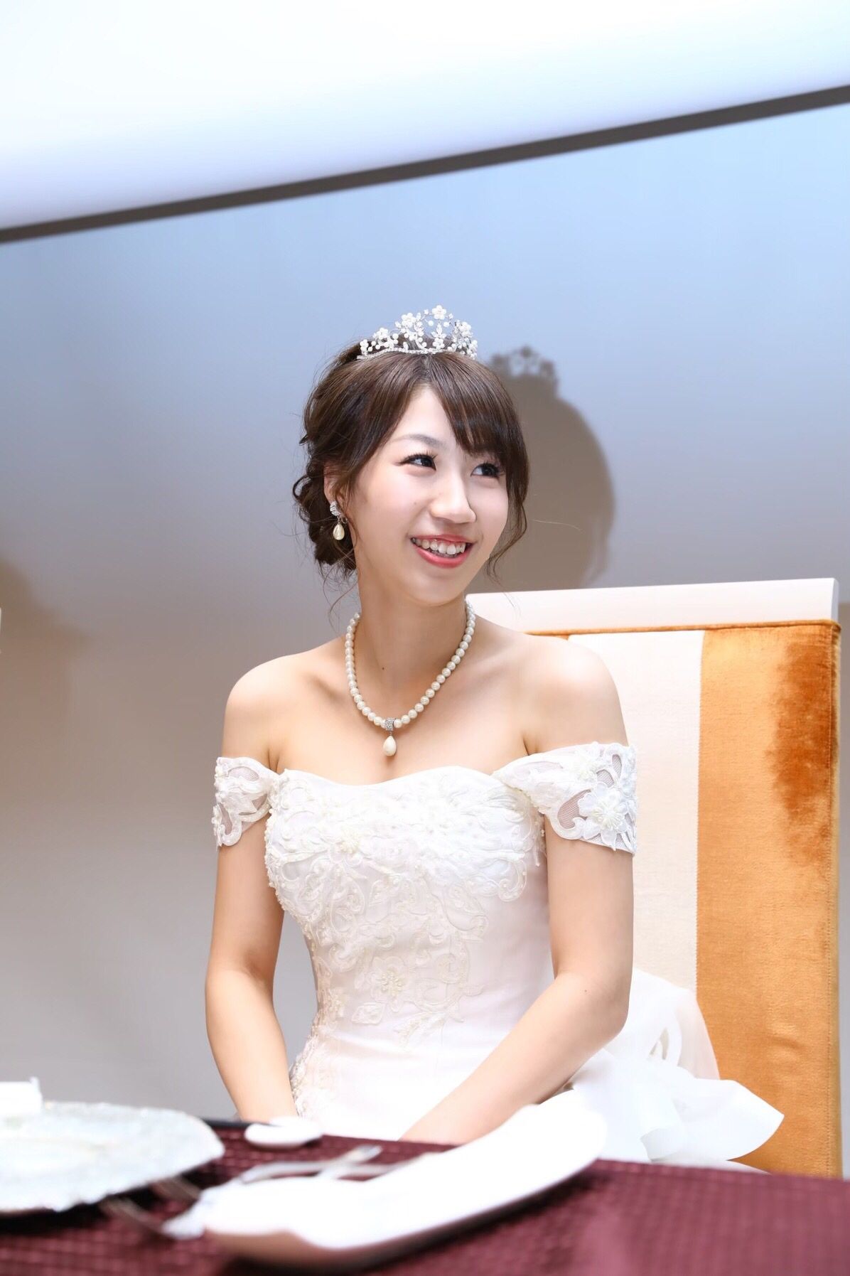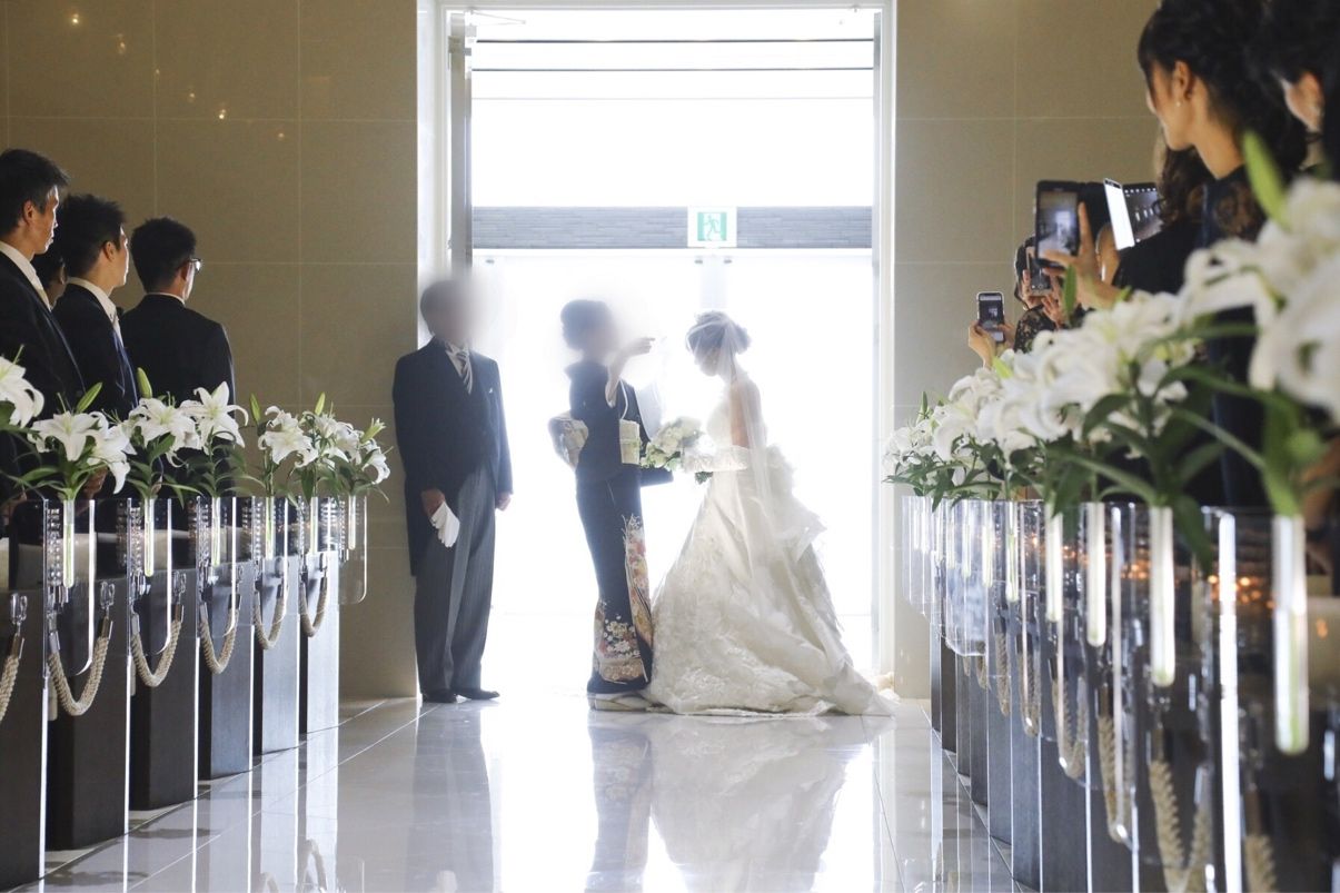 挙式時はオフショルを外し、披露宴入場時はオフショルをつけて同じドレスですが、少し雰囲気を変えれるようなドレスにしたのもポイントです。